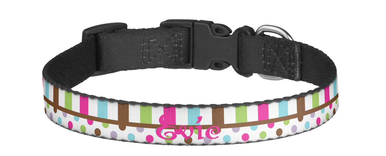 This sturdy collar, made from a durable nylon weave, will outlive your dog's episodes of excited tugging and pulling. Courtesy of its thick plastic buckle and adjuster, this collar is adjustable and accommodating of any dog. Structurally, the collar is a single piece of nylon weave that is sewn together, and features a solid metal loop where you can attach a leash or dog tag. We print and display your dog's name and pattern across the middle of the personalized dog collar.