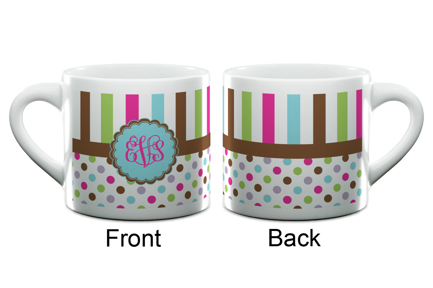 Each of our espresso mugs is a ceramic material sure to keep your drink warm. Personalize one cup for yourself, or order a set of 4! Its the perfect little gift for any coffee lover! We carry two sizes for you to personalize - 3 oz. (approx. 3.25" x 2.325" x 2.625") or 6 oz. (approx. 4" x 2.9" x 2.9"). Our 3 oz. mug is perfect for that single shot espresso while our 6 oz. mug can be your next favorite cappuccino cup holding two shots of espresso!