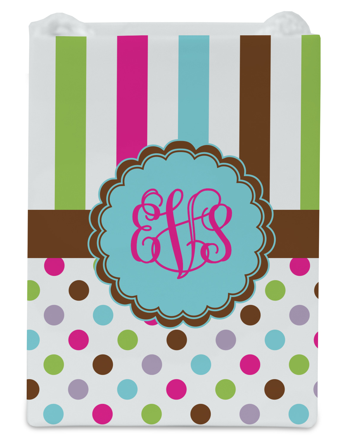 I scream, you scream, we all scream for ice cream! Yummy ice cream colors inspired this design. Chocolate, strawberry, vanilla, cotton candy blue, and lime sherbert are all represented. The top is a traditional striped pattern. On the bottom the same colors are sprinkled about. A lovely chocolate band separates the two patterns.