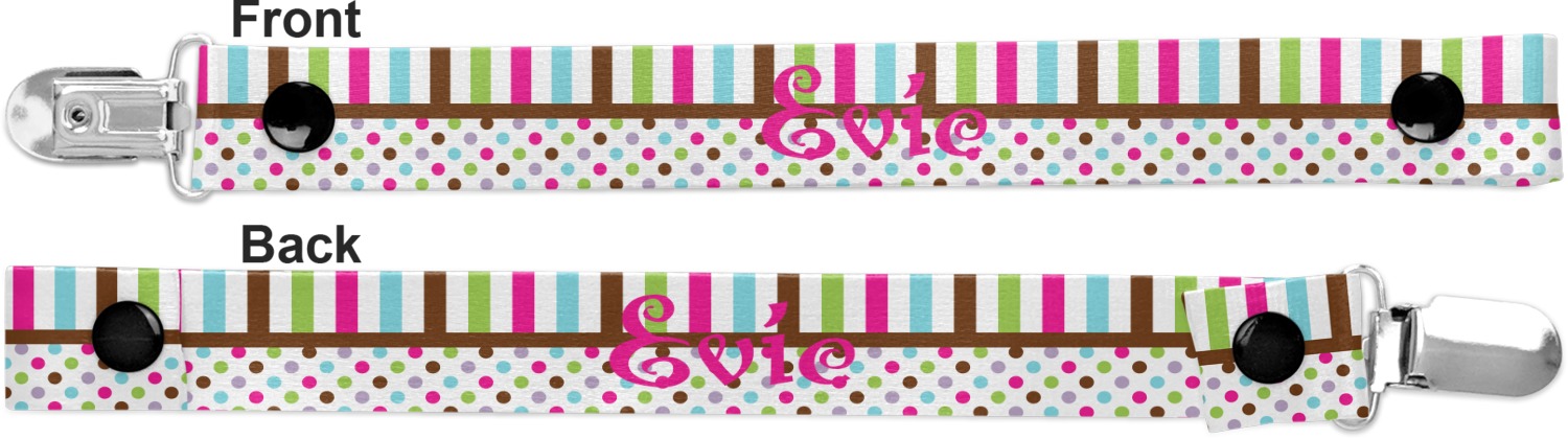 This personalized pacifier clip is the ideal size and measures at approximately 7.5 inches in length, when either end is snapped closed. On one end, you'll find a snap button. This button of your baby's pacifier holder is what can be attached to their pacifier to hold is securely in place. Simply open the snap, slip it through the pacifier opening, and snap it back into place. On the opposite end of this baby pacifier holder, you'll find a metal clip that can secure to a baby's collar or sleeve. This clip ensures that the strap stays in place, and that your baby's pacifier is always on hand.