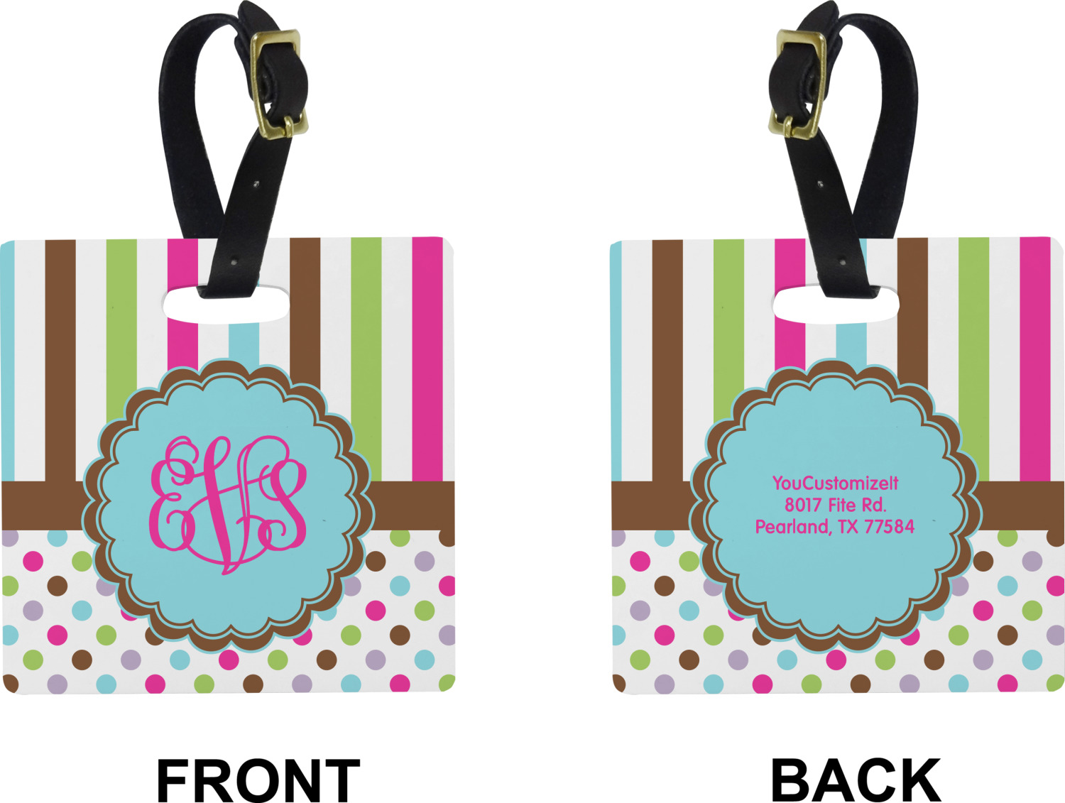 These personalized bag tags are sold in a variety of shapes, so that you may find the product that meets your vision exactly. We sell a round luggage tag, which measures at approximately 4" x 4". Our square luggage tag is about 3.5" x 3.5", while our rectangular version is 2.75" x 4 ".