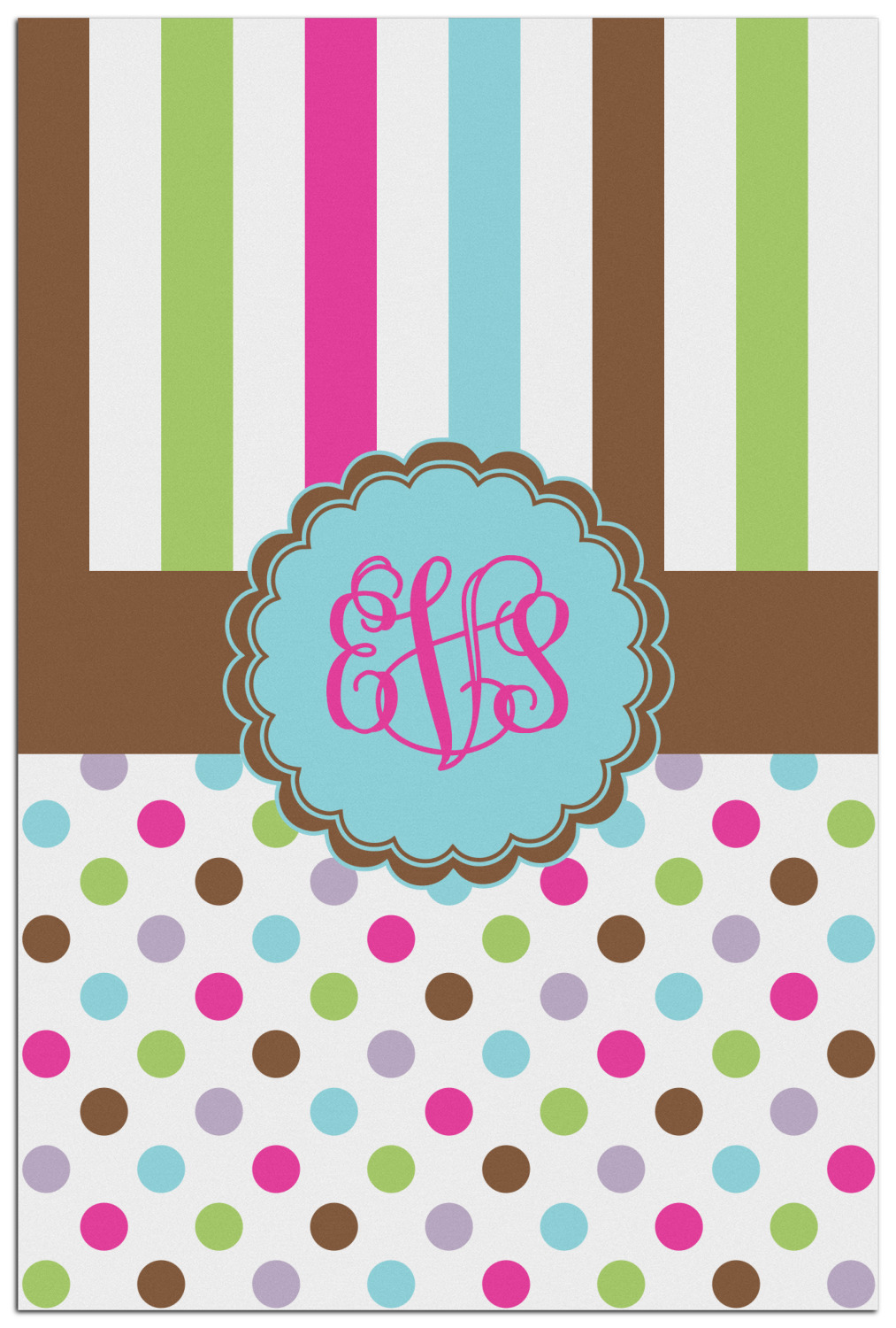 I scream, you scream, we all scream for ice cream! Yummy ice cream colors inspired this design. Chocolate, strawberry, vanilla, cotton candy blue, and lime sherbert are all represented. The top is a traditional striped pattern. On the bottom the same colors are sprinkled about. A lovely chocolate band separates the two patterns.