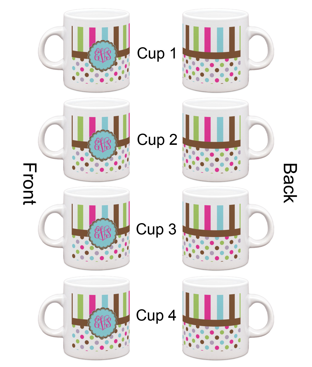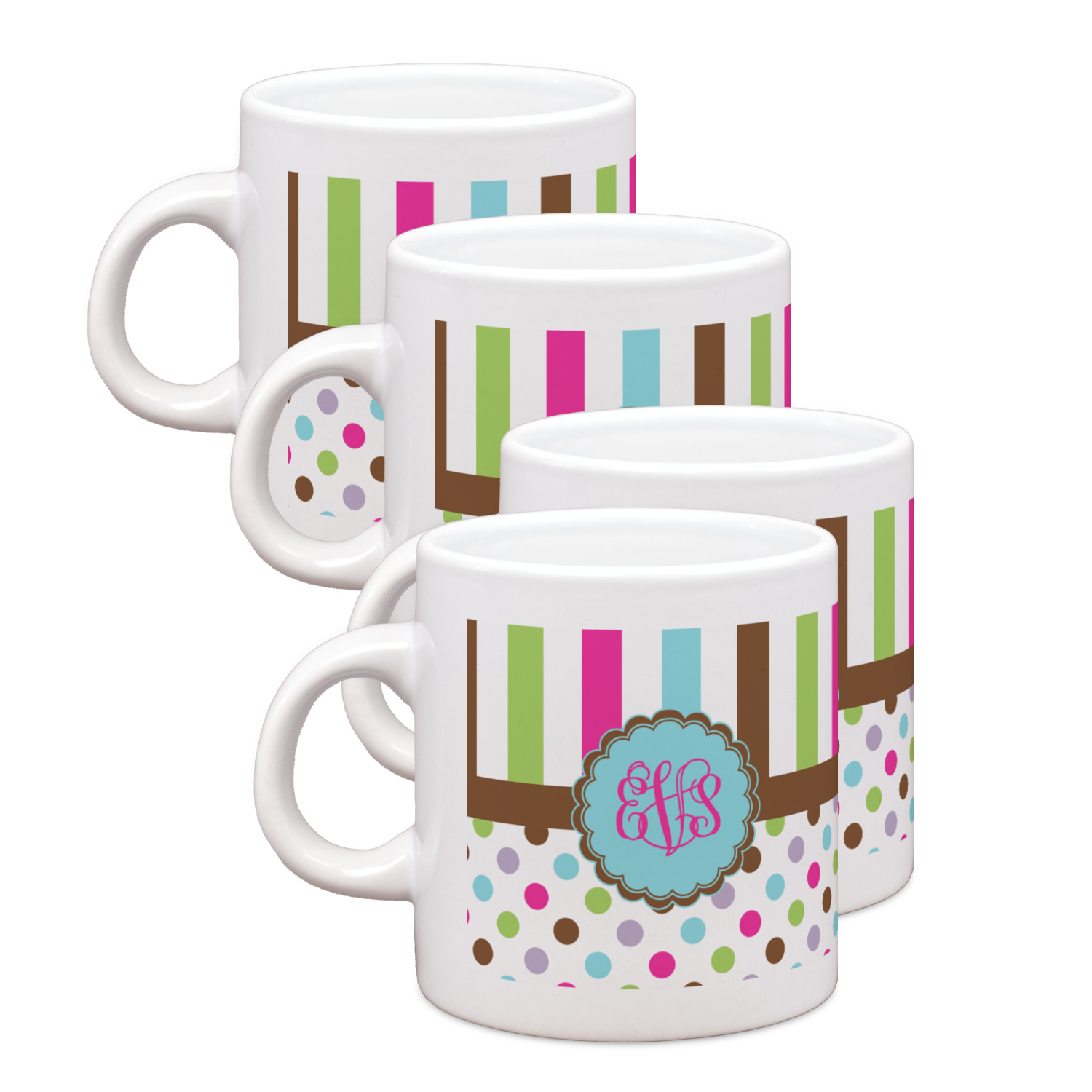 Each of our espresso mugs is a ceramic material sure to keep your drink warm. Personalize one cup for yourself, or order a set of 4! Its the perfect little gift for any coffee lover! We carry two sizes for you to personalize - 3 oz. (approx. 3.25" x 2.325" x 2.625") or 6 oz. (approx. 4" x 2.9" x 2.9"). Our 3 oz. mug is perfect for that single shot espresso while our 6 oz. mug can be your next favorite cappuccino cup holding two shots of espresso!