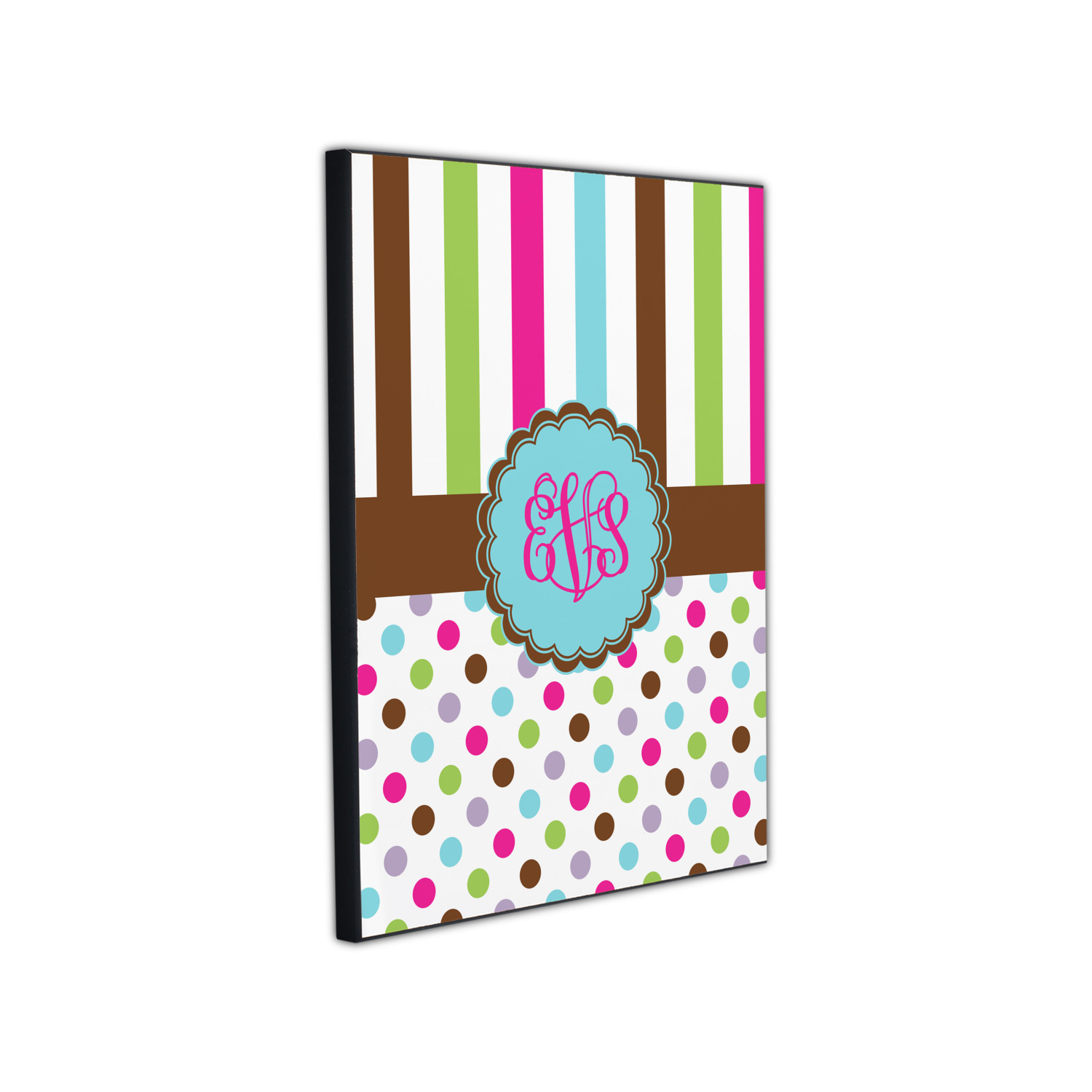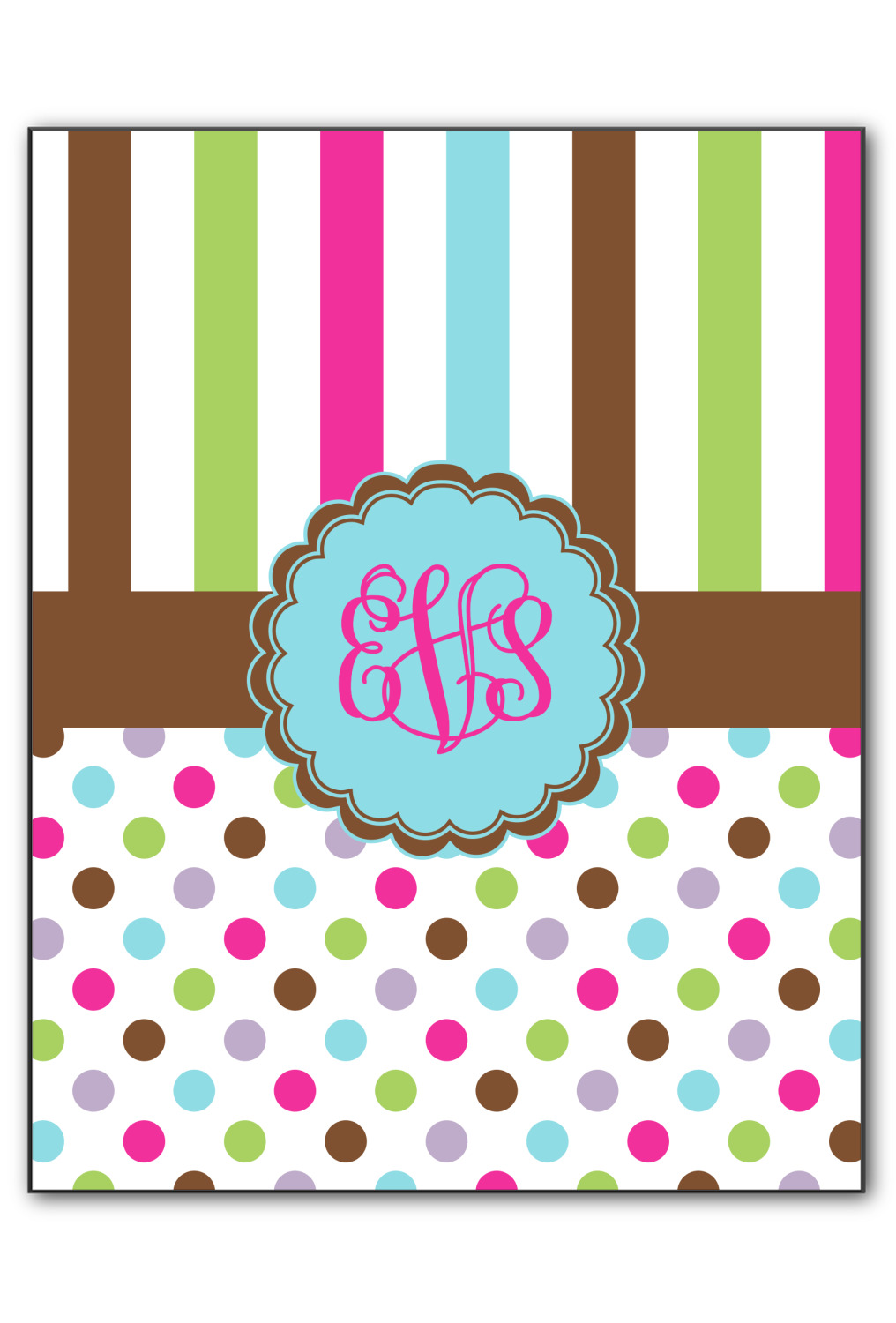 I scream, you scream, we all scream for ice cream! Yummy ice cream colors inspired this design. Chocolate, strawberry, vanilla, cotton candy blue, and lime sherbert are all represented. The top is a traditional striped pattern. On the bottom the same colors are sprinkled about. A lovely chocolate band separates the two patterns.