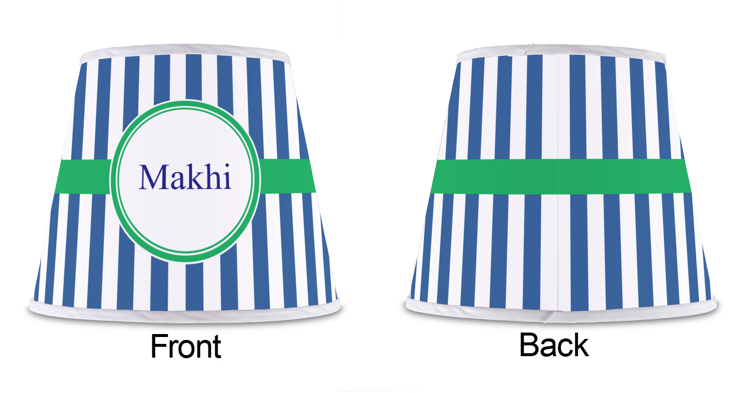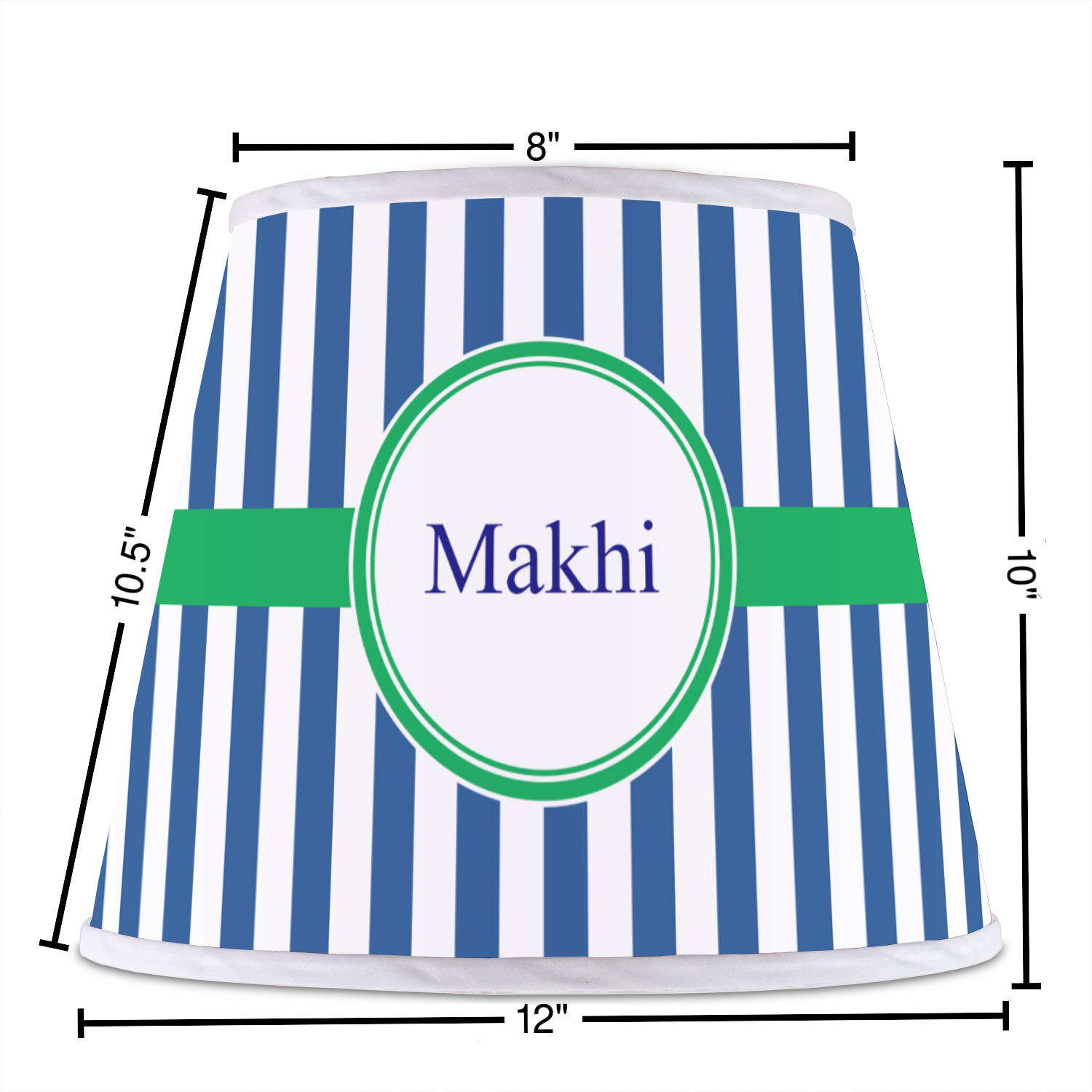 The base of this lampshade is 12 inches in diameter, and the top spans 8 inches in diameter. The total height of the lampshade is 10 inches. The angled nature of this custom lampshade concentrates the light, making it ideal for smaller spaces. This lampshade is made of matte, polyfilm, and displays your customization in its middle. The top and bottom of this colorful lamp shade are lined with a white fabric ribbon (which can be replaced with black inside the design studio) which frames your design and creates a sophisticated finish. As an UNO fitter lampshade, this unique lamp shade will fit a variety of bases.