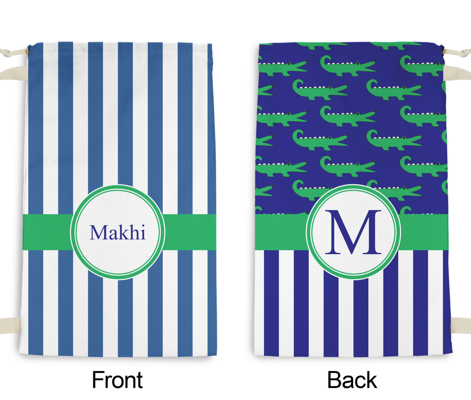 Carry your laundry in style with these customized laundry bags. Available in two sizes, featuring a natural colored woven strap and a cinch cord, these bags hold a lot of clothes or anything else you want to fit in them.