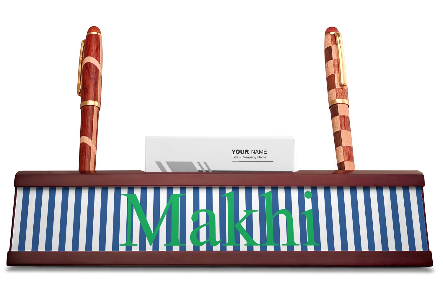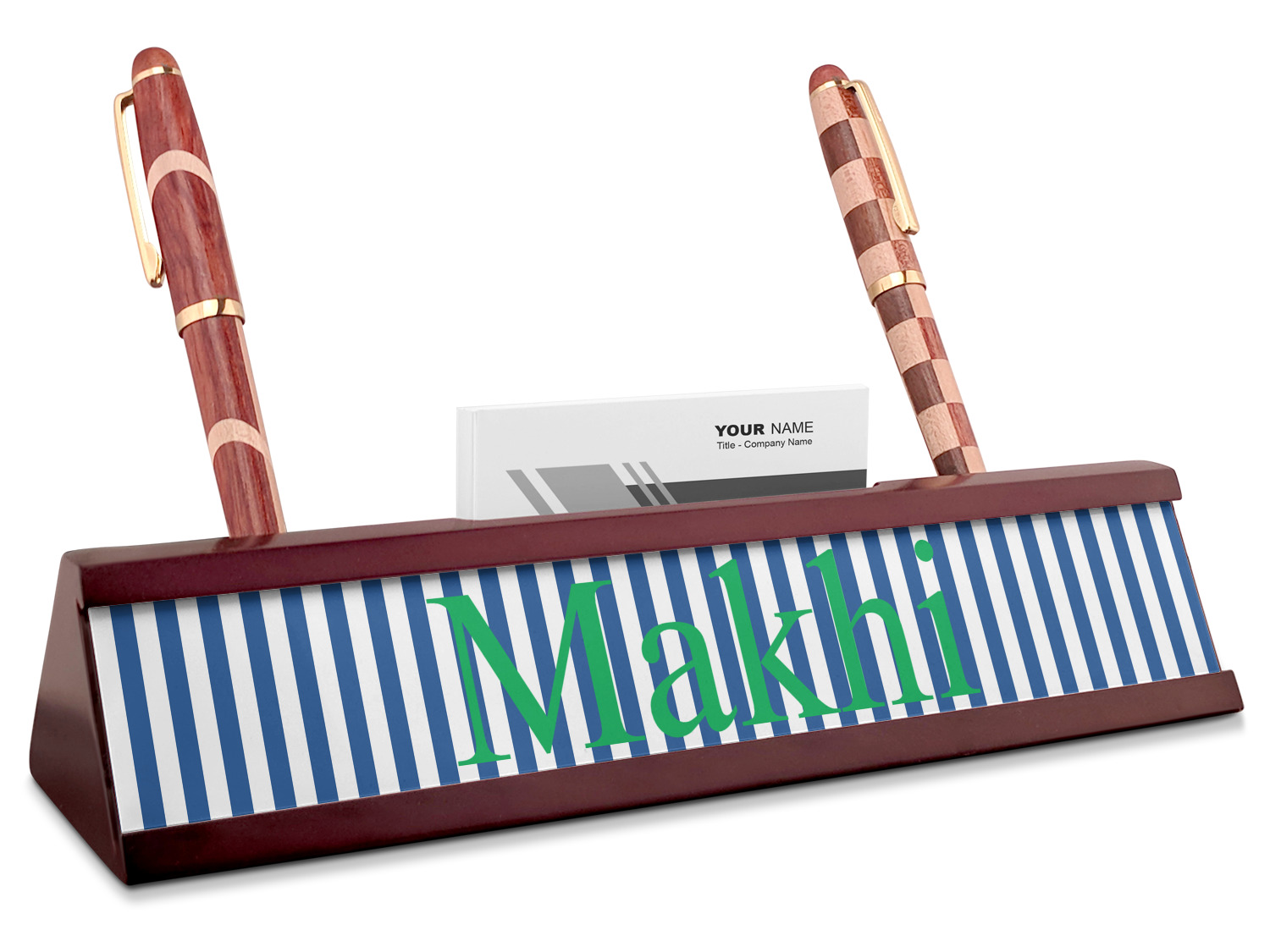 Your desk name plates are crafted from a high-quality, dark-cherry mahogany. At approximately 9.5 by 1.875 by 2.5 inches, this name plaque will fit perfectly, front and center, on your desk. Your customization spans across the entire face of the nameplate. Behind the nameplate lies a skinny slot that can fit approximately 15, traditionally-sized, business cards. You can also store your writing utensils on either side of this custom desk name plate.