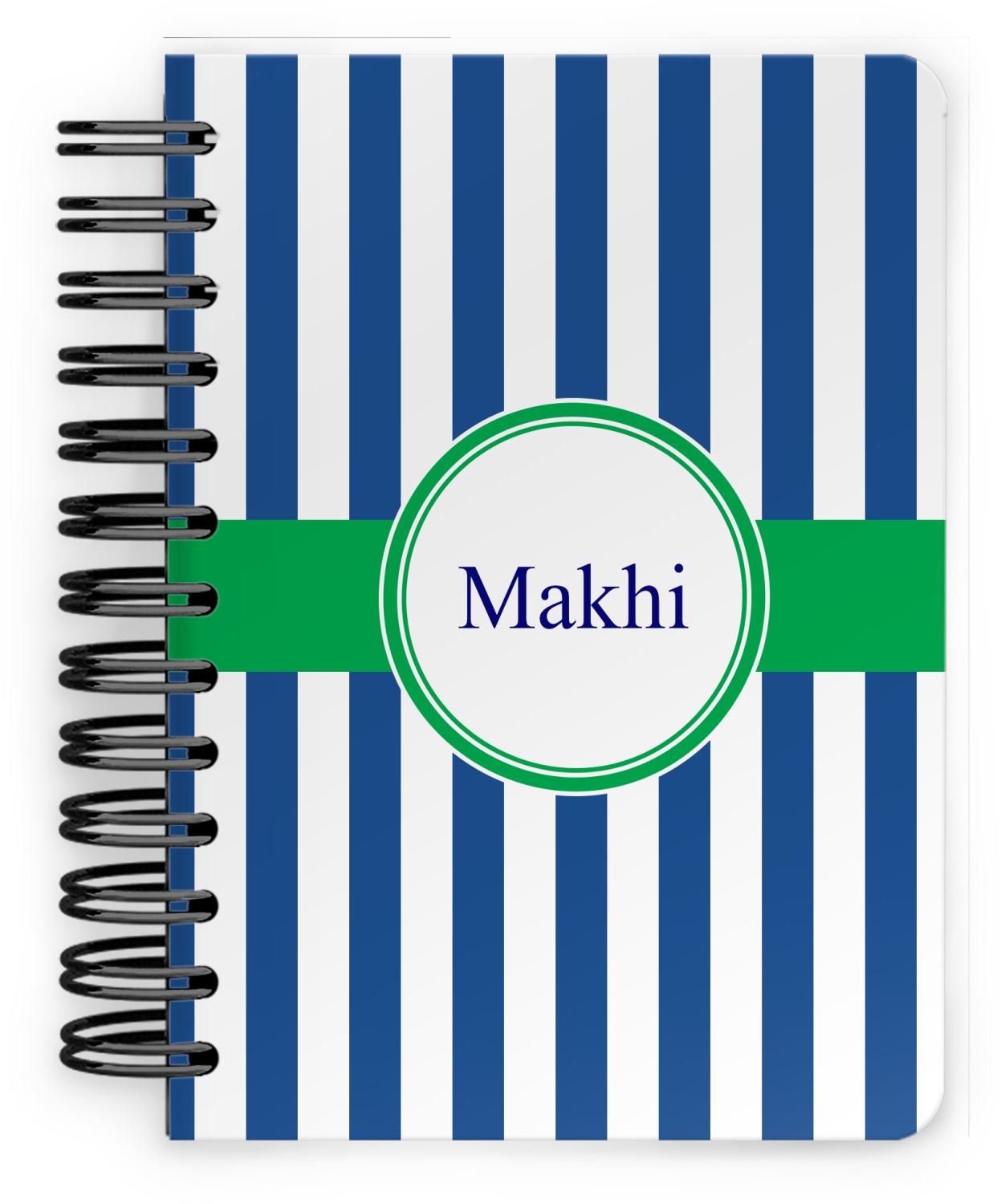 This spiral notebook includes 75 sheets of thick, ruled paper. The front and back of this custom notebook is made of a robust, laminate, plastic covering. We print your personalization on these two panels, underneath a glossy finish, which emphasizes the colors of your design. The two panels and the sheets of paper are held together by a sturdy, black coil. The paper within your bound notebook is perforated for easy, clean tearing.