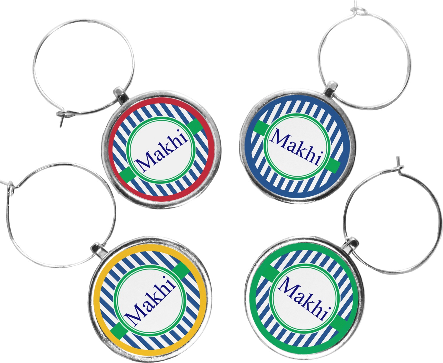 Your wine glass markers are comprised of a circular zinc plate with a 1.25 inch diameter. The zinc plate hangs from a zinc loop, which can be easily secured and removed from the stem of a wine glass. Your customized design is printed onto a 1 inch diameter insert, and then placed into the wine glass charm itself. Though sold in a set of four, you can personalize each charm individually and change the colors of the ring around your design, depending on your needs.
