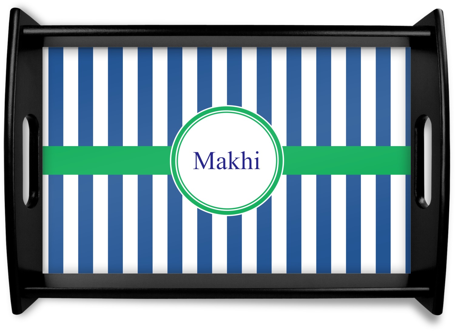 This serving tray with handles features square edges and two rounded sides, creating a very modern look. Each side is fabricated from a beautifully cut, natural wood. The bottom of the interior of the tray displays your customized design in bright, vibrant color. The tray is sold in both a black color and a natural wood look. Each variation of the wood serving tray has two sizes: Small, which is 14" x 10" x 2.25", and Large, which is 19.5" x 13.5" x 2.75".