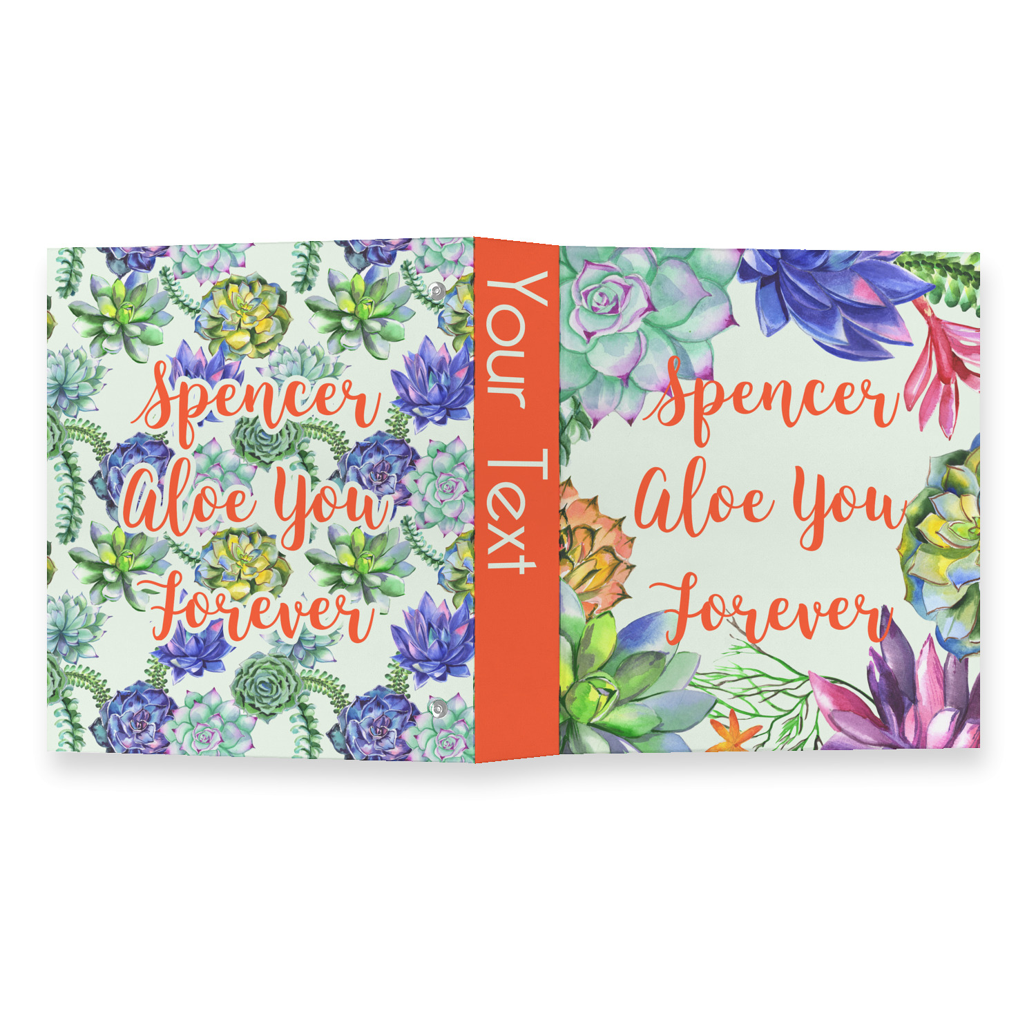 This design is made up of a beautiful frame of succulent illustrations. Because of the nature of the frame, this design will look different on every product. The background is a calming light green. The middle text says "Spencer, Aloe You Forever", which can easily be personalized to your own name or someone else's. You will find orange, green, purple, pink, and orange in this lovely design.