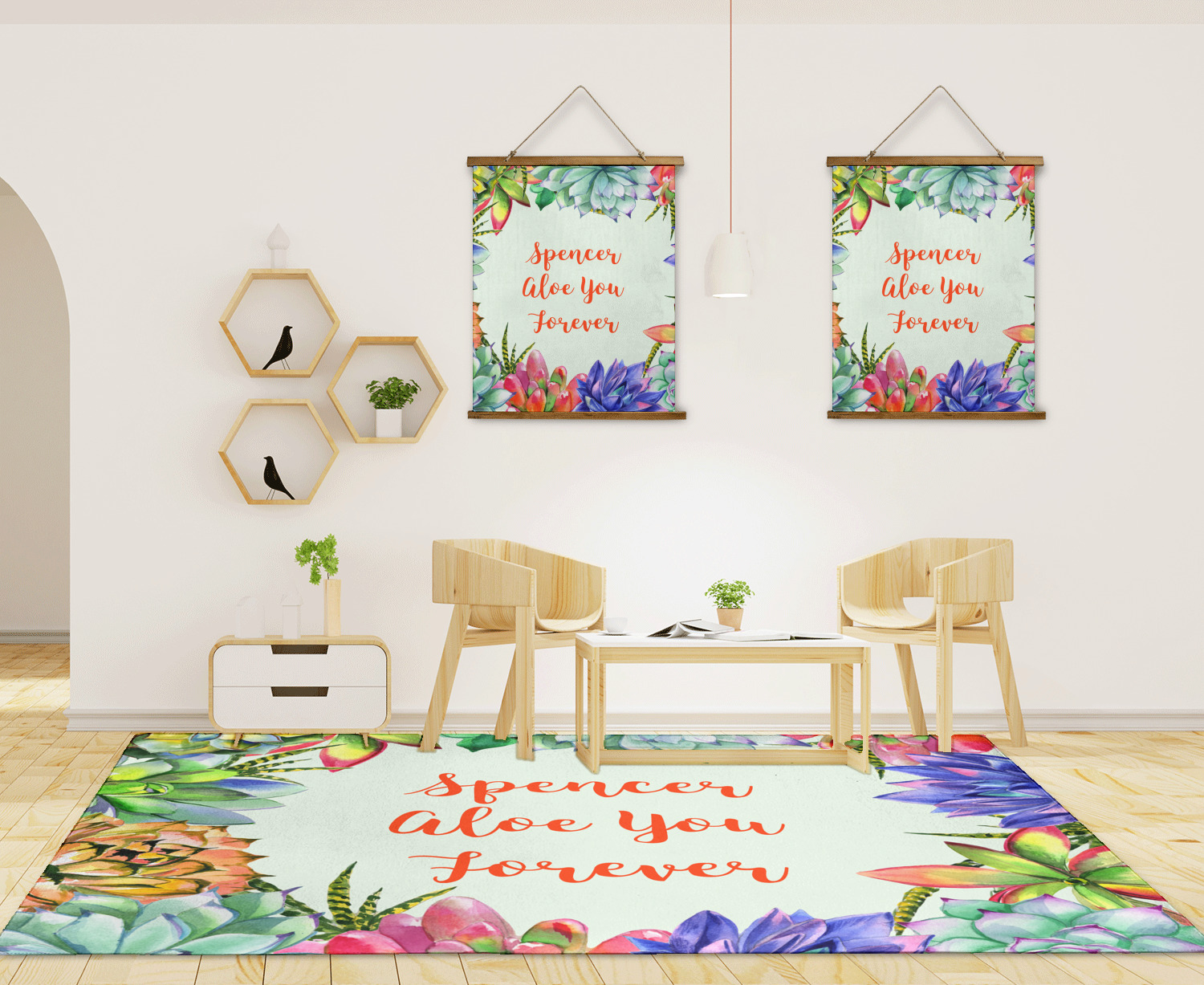 This design is made up of a beautiful frame of succulent illustrations. Because of the nature of the frame, this design will look different on every product. The background is a calming light green. The middle text says "Spencer, Aloe You Forever", which can easily be personalized to your own name or someone else's. You will find orange, green, purple, pink, and orange in this lovely design.