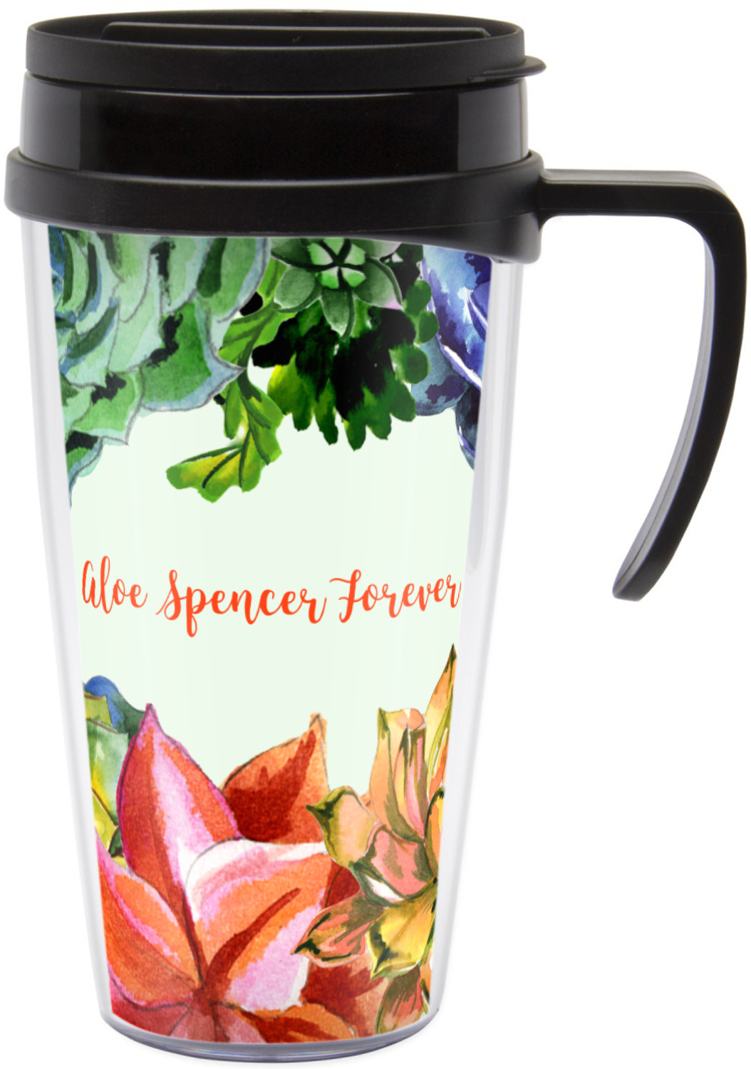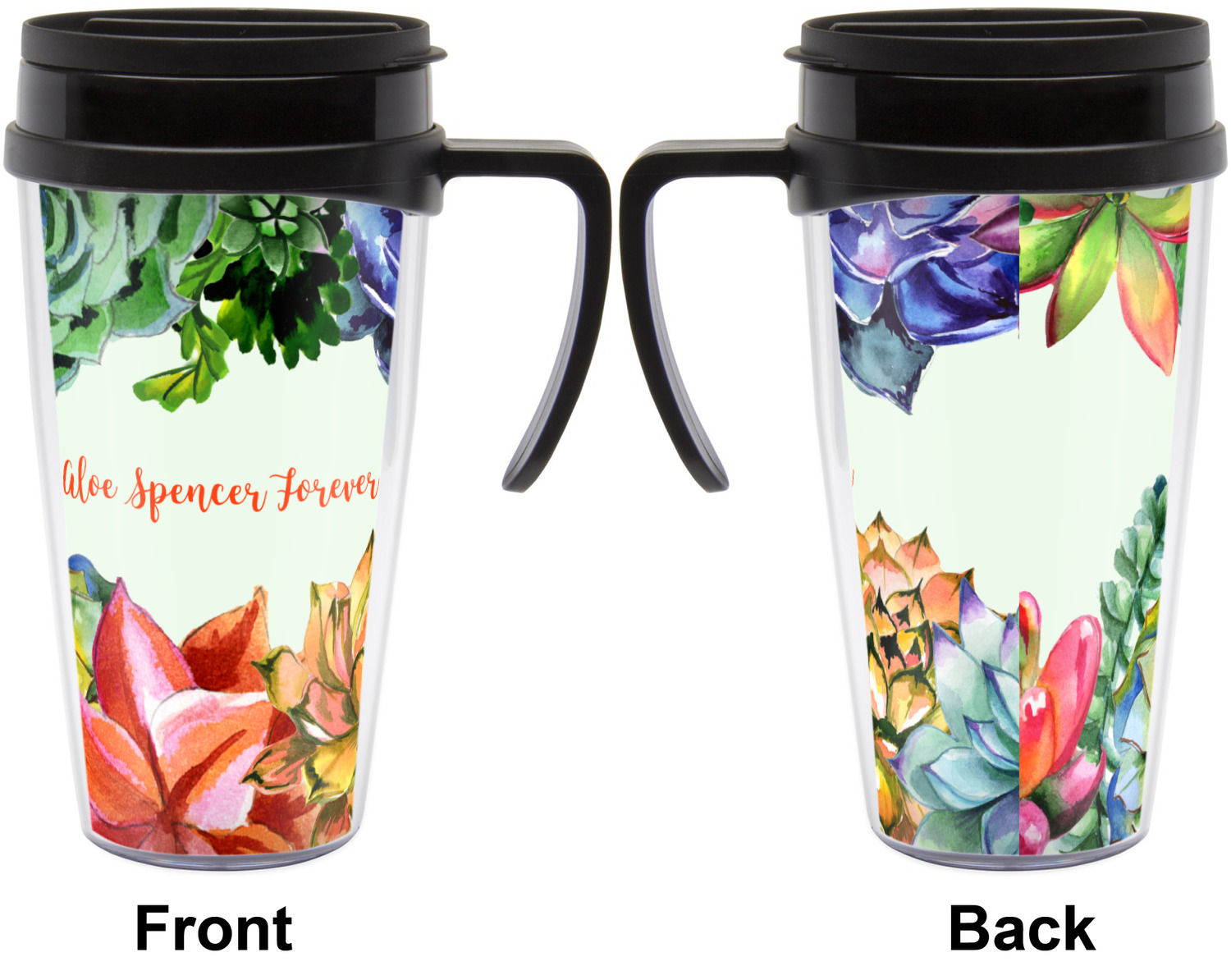 These thermal mugs are free of BPA, and insulated, to keep your drinks hot or cold. The black, snap on lid and the slider for sipping allows you to conveniently sip your drink without constantly worrying about a disastrous spill. We offer this mug with and without a handle, to better suit your needs. Each custom thermal mug holds up to 16 ounces of liquid and displays your customization on all sides on premium gloss media inserts.