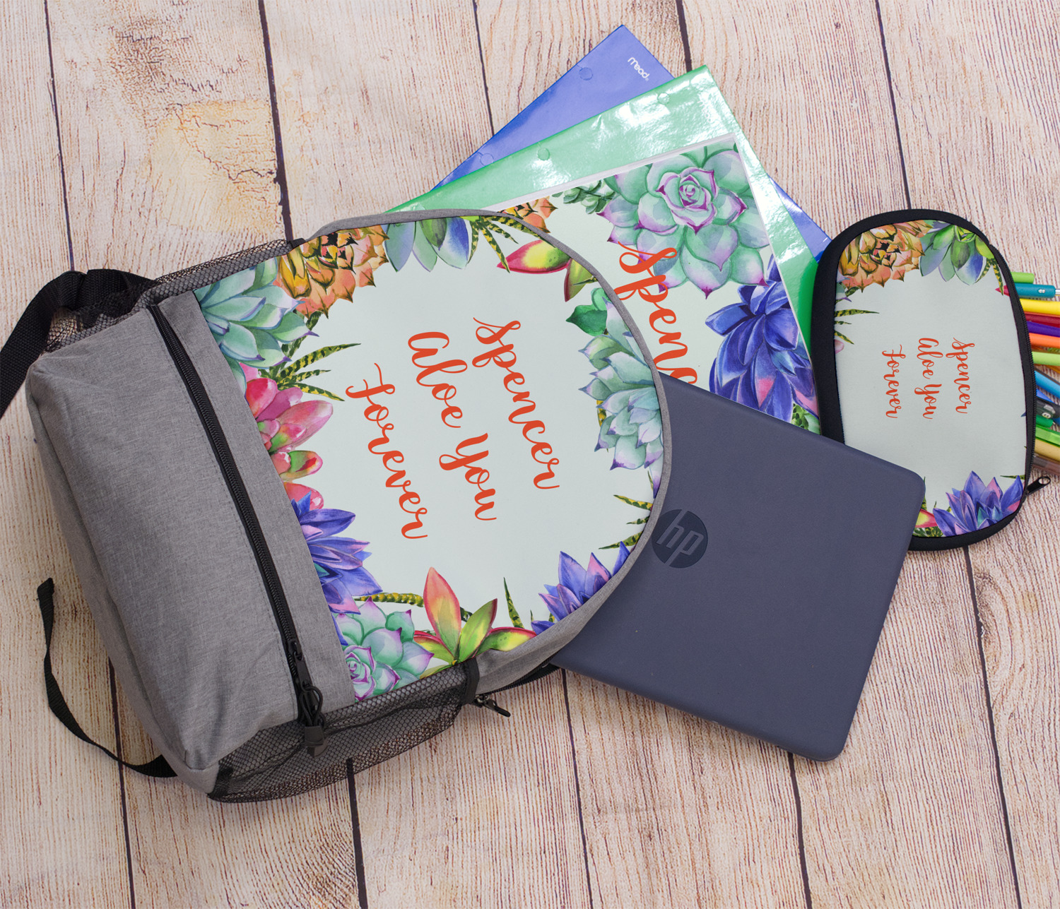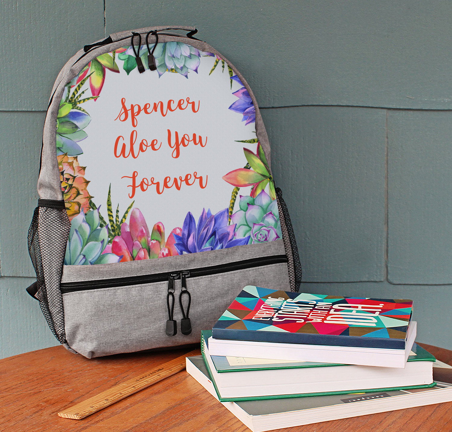 This design is made up of a beautiful frame of succulent illustrations. Because of the nature of the frame, this design will look different on every product. The background is a calming light green. The middle text says "Spencer, Aloe You Forever", which can easily be personalized to your own name or someone else's. You will find orange, green, purple, pink, and orange in this lovely design.