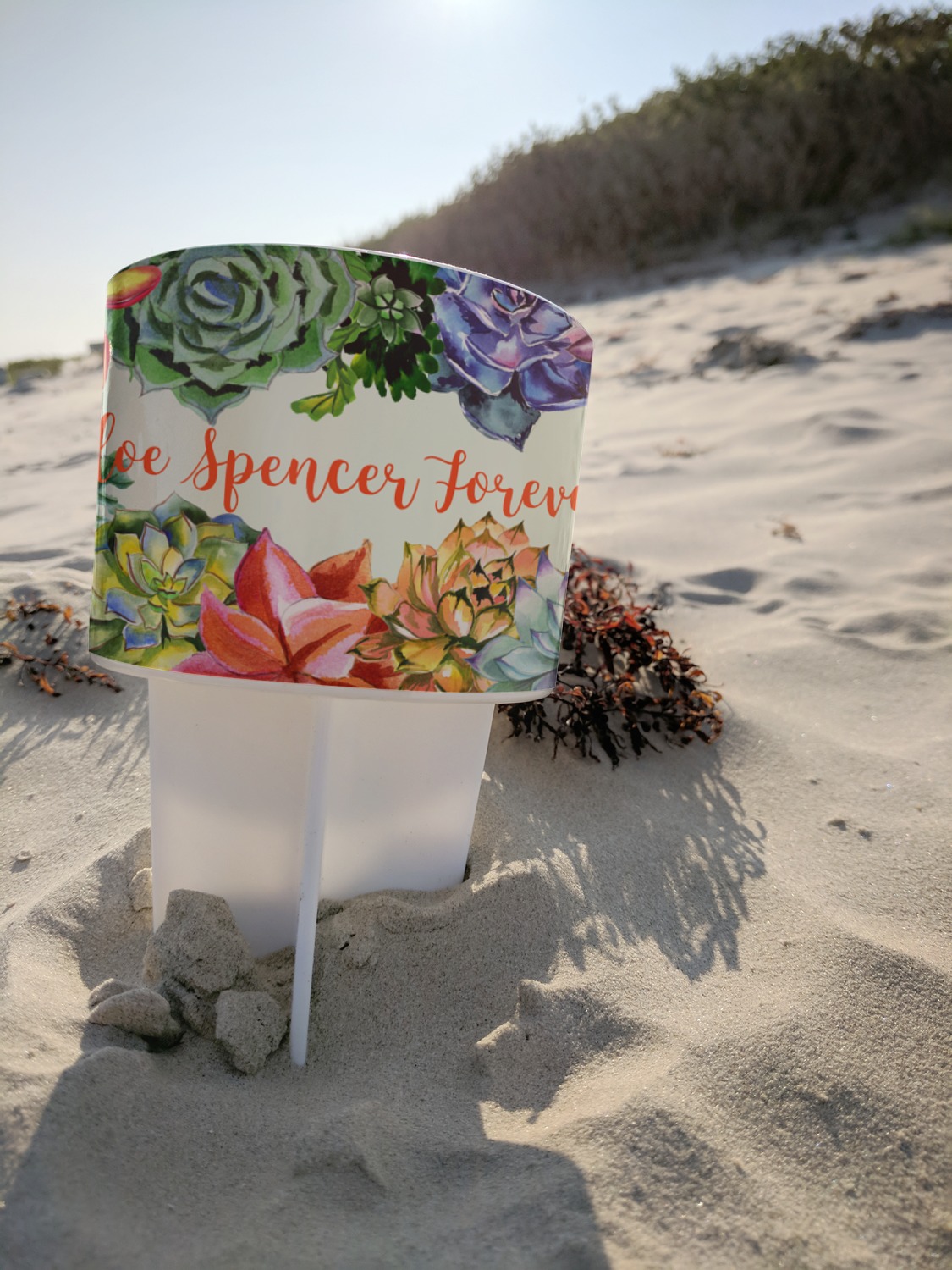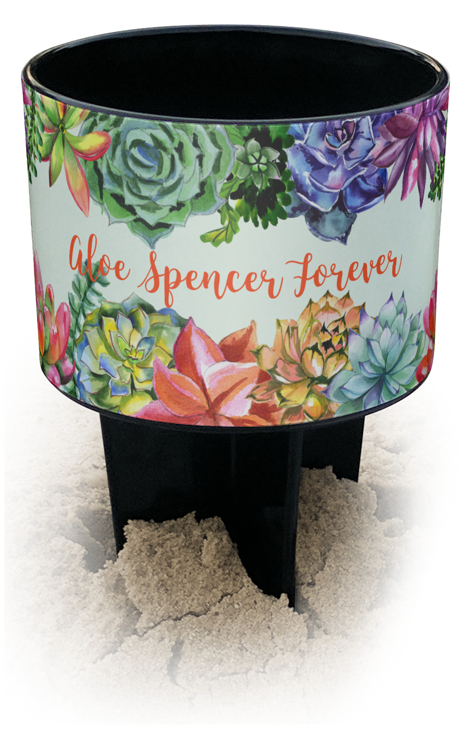 This cup holder has a large stake at its bottom that anchors it to the sand or ground below, while the cup holder rests above the stake. The entire drink holder is made of durable plastic and displays your customization around the cup holder portion. We sell these personalized beach spikers in two different colors: black and white.