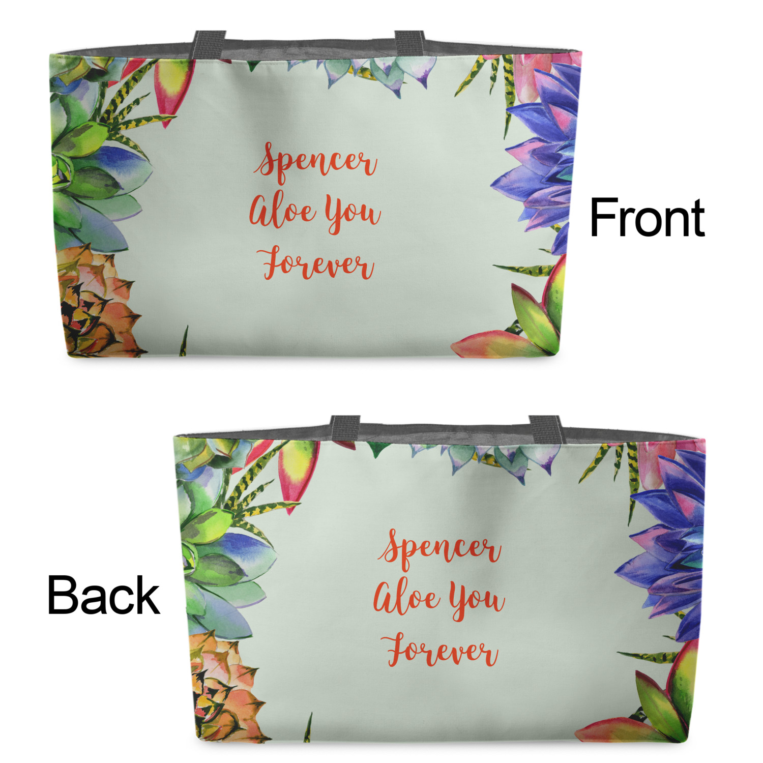These beach totes are handmade here in the USA. Fabric is printed with your design. The tote is then sewn from the fabric pieces, lining and handles added.