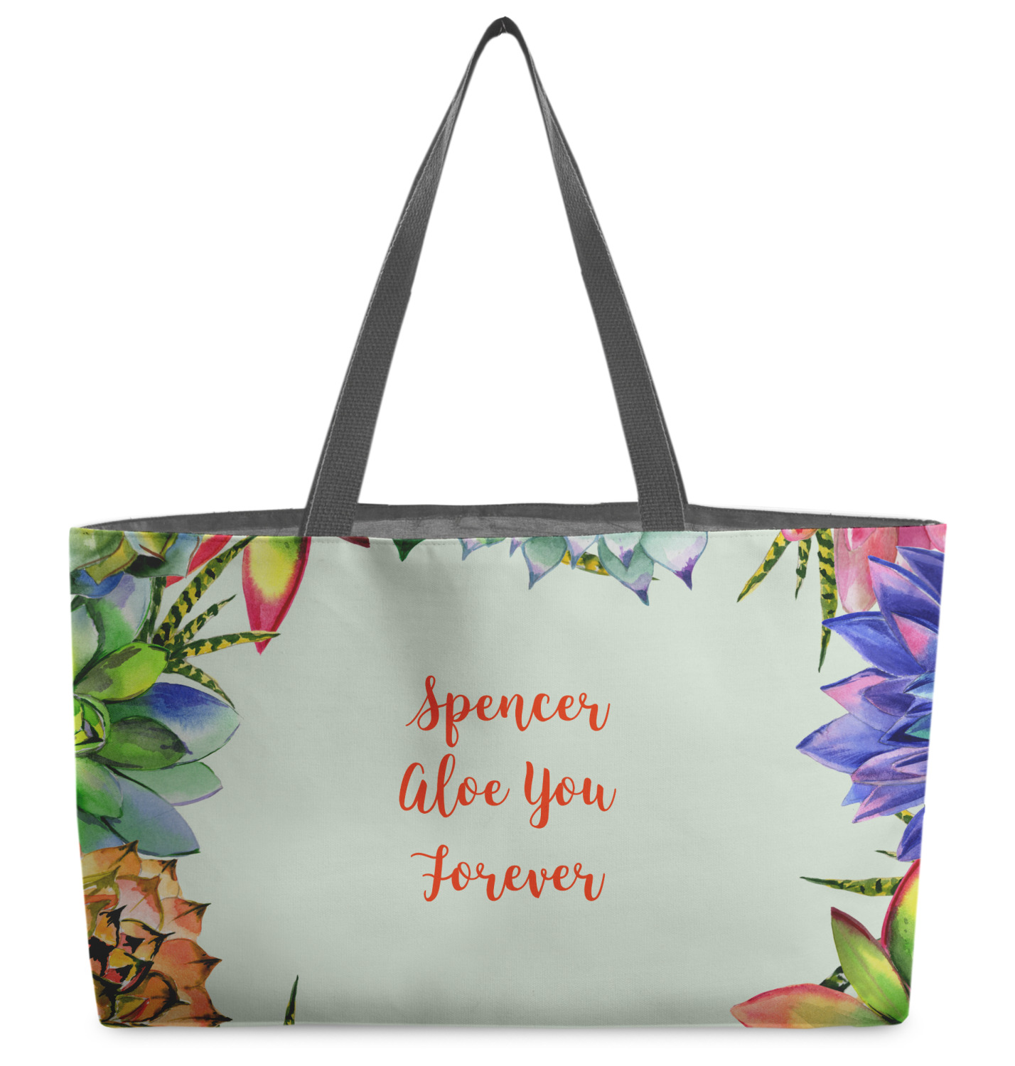 This design is made up of a beautiful frame of succulent illustrations. Because of the nature of the frame, this design will look different on every product. The background is a calming light green. The middle text says "Spencer, Aloe You Forever", which can easily be personalized to your own name or someone else's. You will find orange, green, purple, pink, and orange in this lovely design.