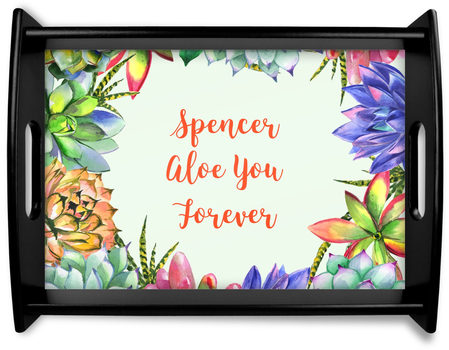 This design is made up of a beautiful frame of succulent illustrations. Because of the nature of the frame, this design will look different on every product. The background is a calming light green. The middle text says "Spencer, Aloe You Forever", which can easily be personalized to your own name or someone else's. You will find orange, green, purple, pink, and orange in this lovely design.