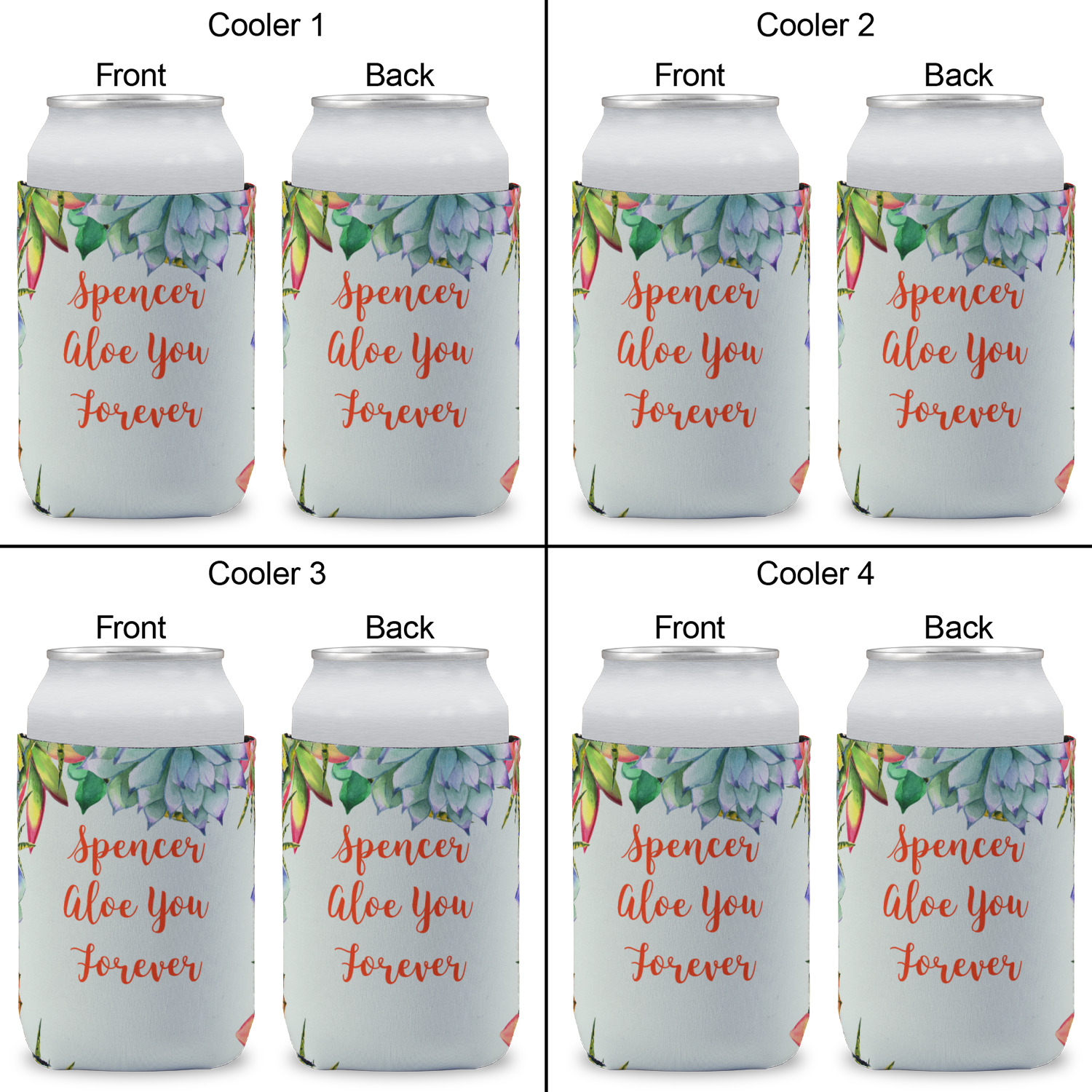 This design is made up of a beautiful frame of succulent illustrations. Because of the nature of the frame, this design will look different on every product. The background is a calming light green. The middle text says "Spencer, Aloe You Forever", which can easily be personalized to your own name or someone else's. You will find orange, green, purple, pink, and orange in this lovely design.