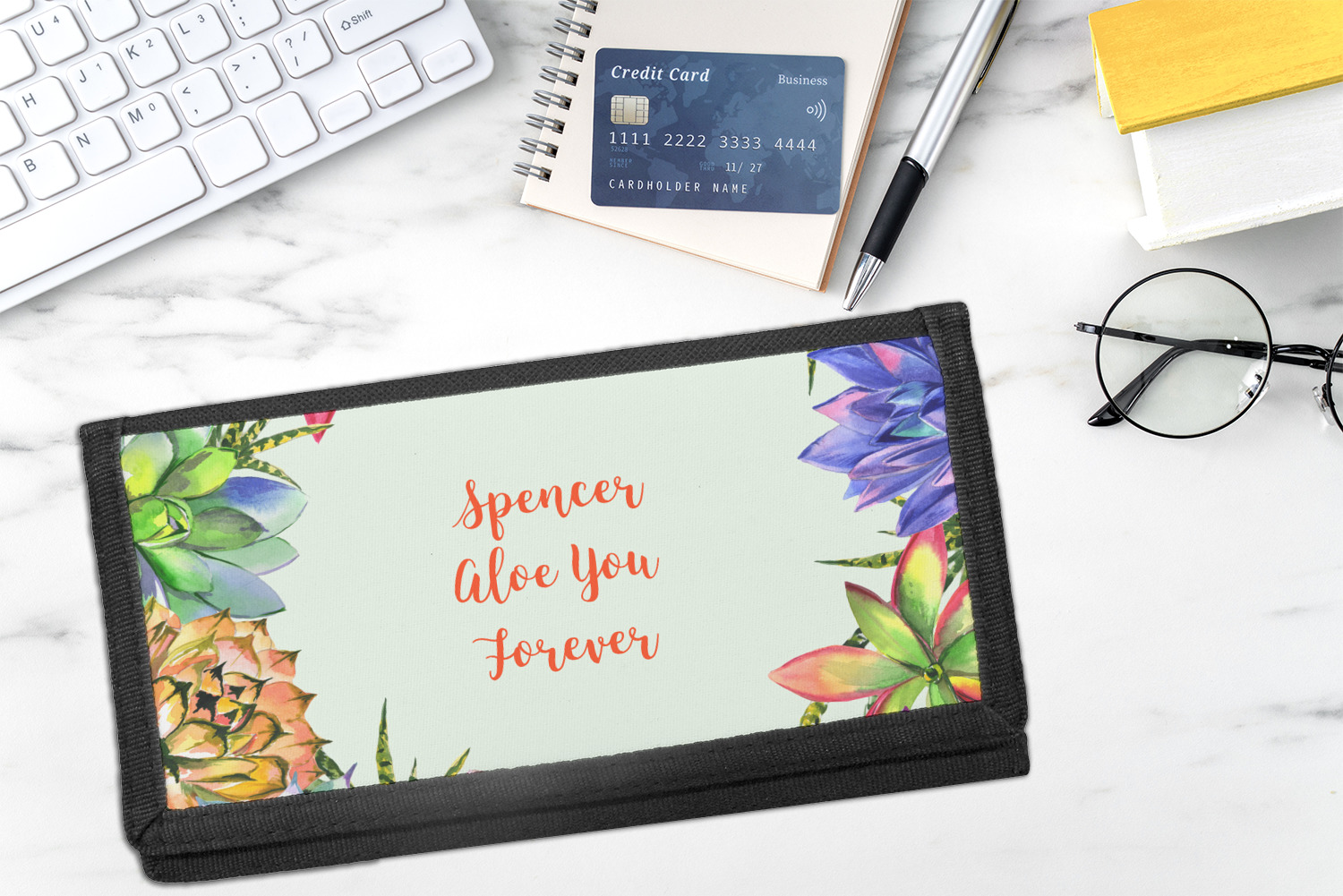 This design is made up of a beautiful frame of succulent illustrations. Because of the nature of the frame, this design will look different on every product. The background is a calming light green. The middle text says "Spencer, Aloe You Forever", which can easily be personalized to your own name or someone else's. You will find orange, green, purple, pink, and orange in this lovely design.