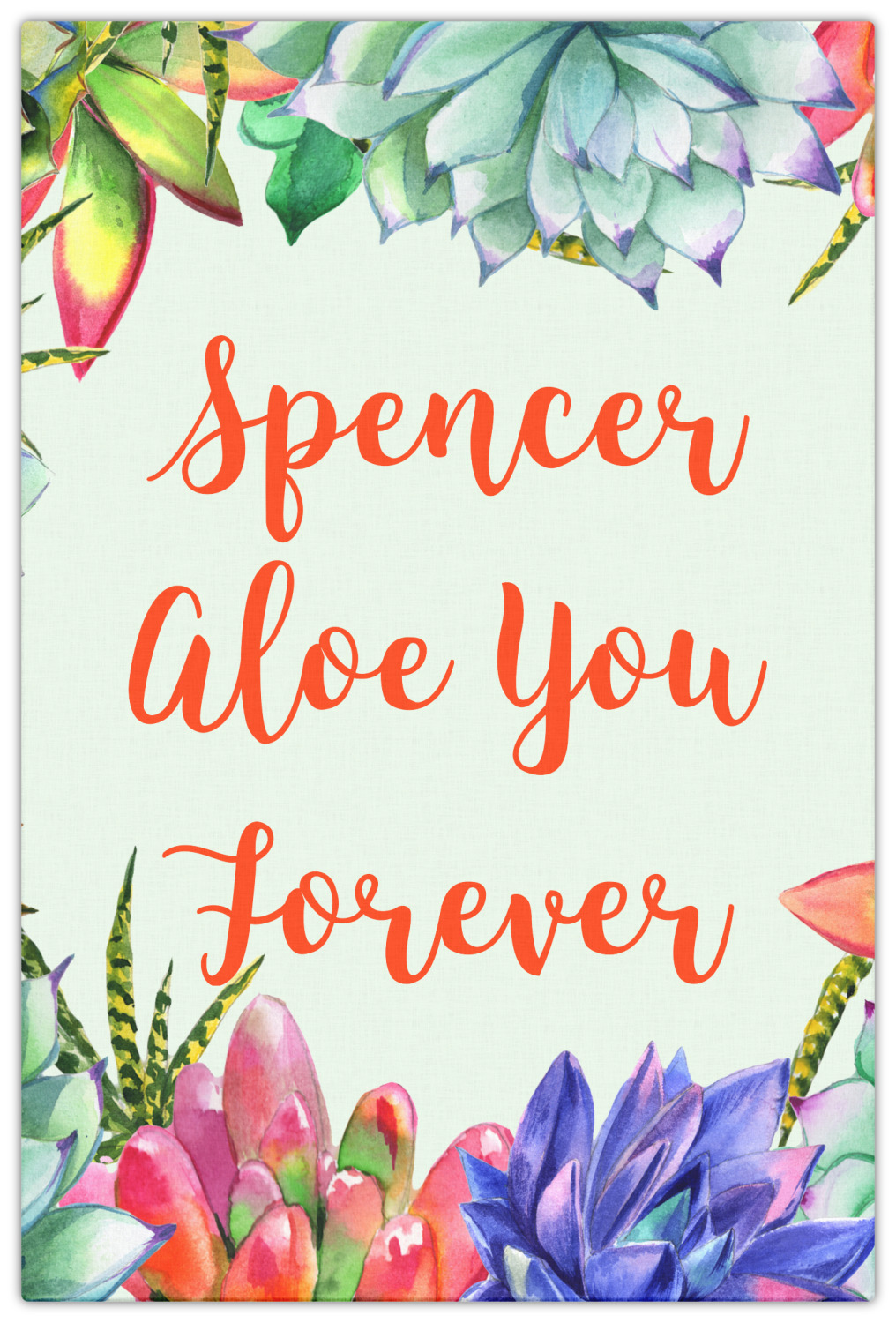 This design is made up of a beautiful frame of succulent illustrations. Because of the nature of the frame, this design will look different on every product. The background is a calming light green. The middle text says "Spencer, Aloe You Forever", which can easily be personalized to your own name or someone else's. You will find orange, green, purple, pink, and orange in this lovely design.