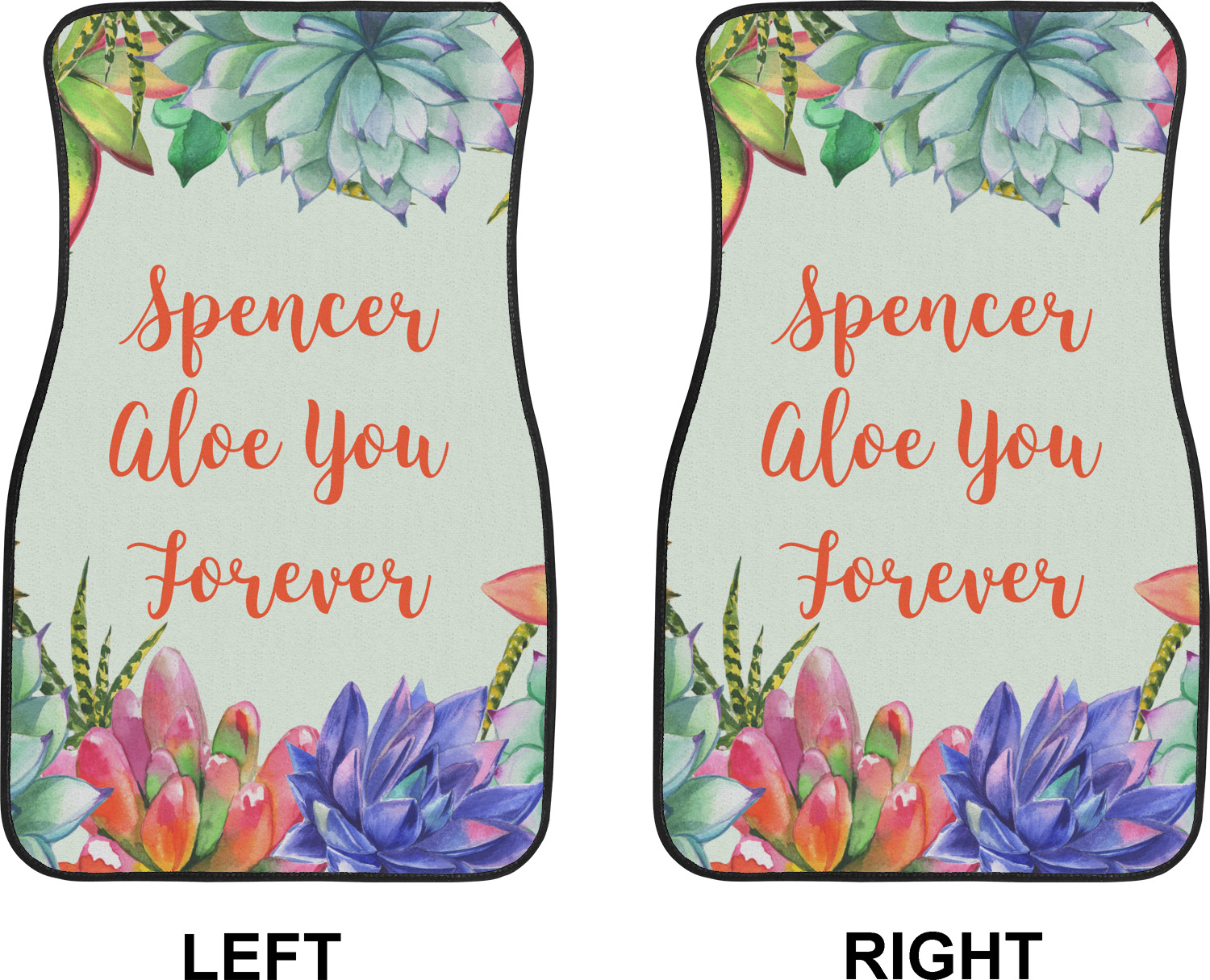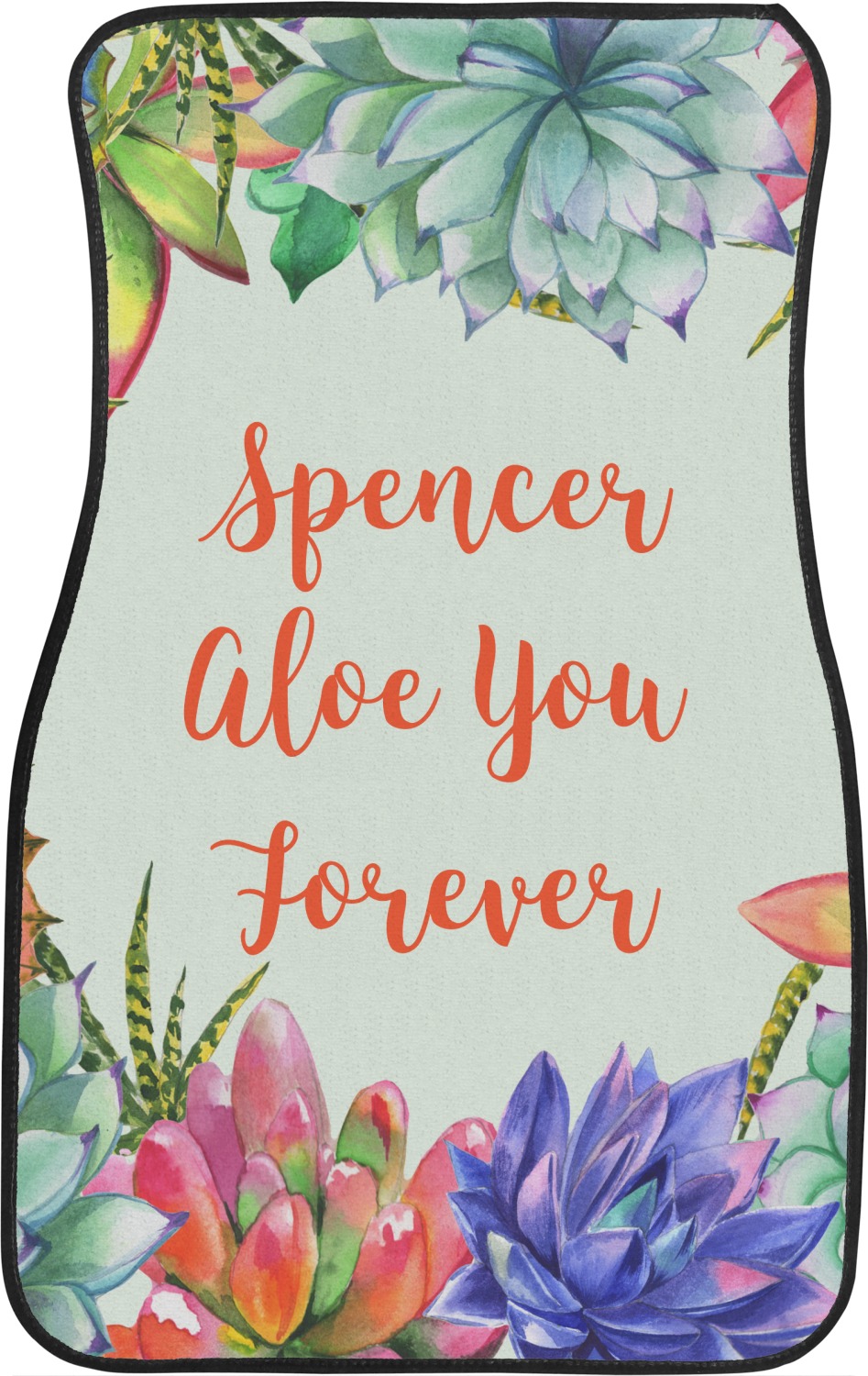 This design is made up of a beautiful frame of succulent illustrations. Because of the nature of the frame, this design will look different on every product. The background is a calming light green. The middle text says "Spencer, Aloe You Forever", which can easily be personalized to your own name or someone else's. You will find orange, green, purple, pink, and orange in this lovely design.