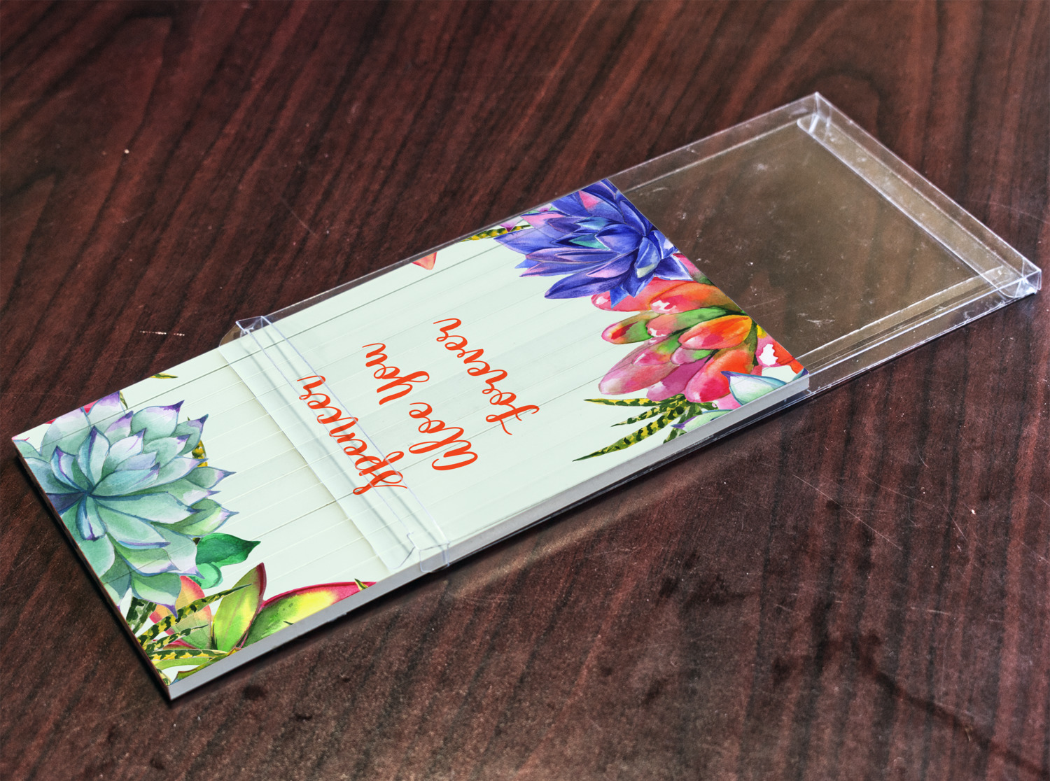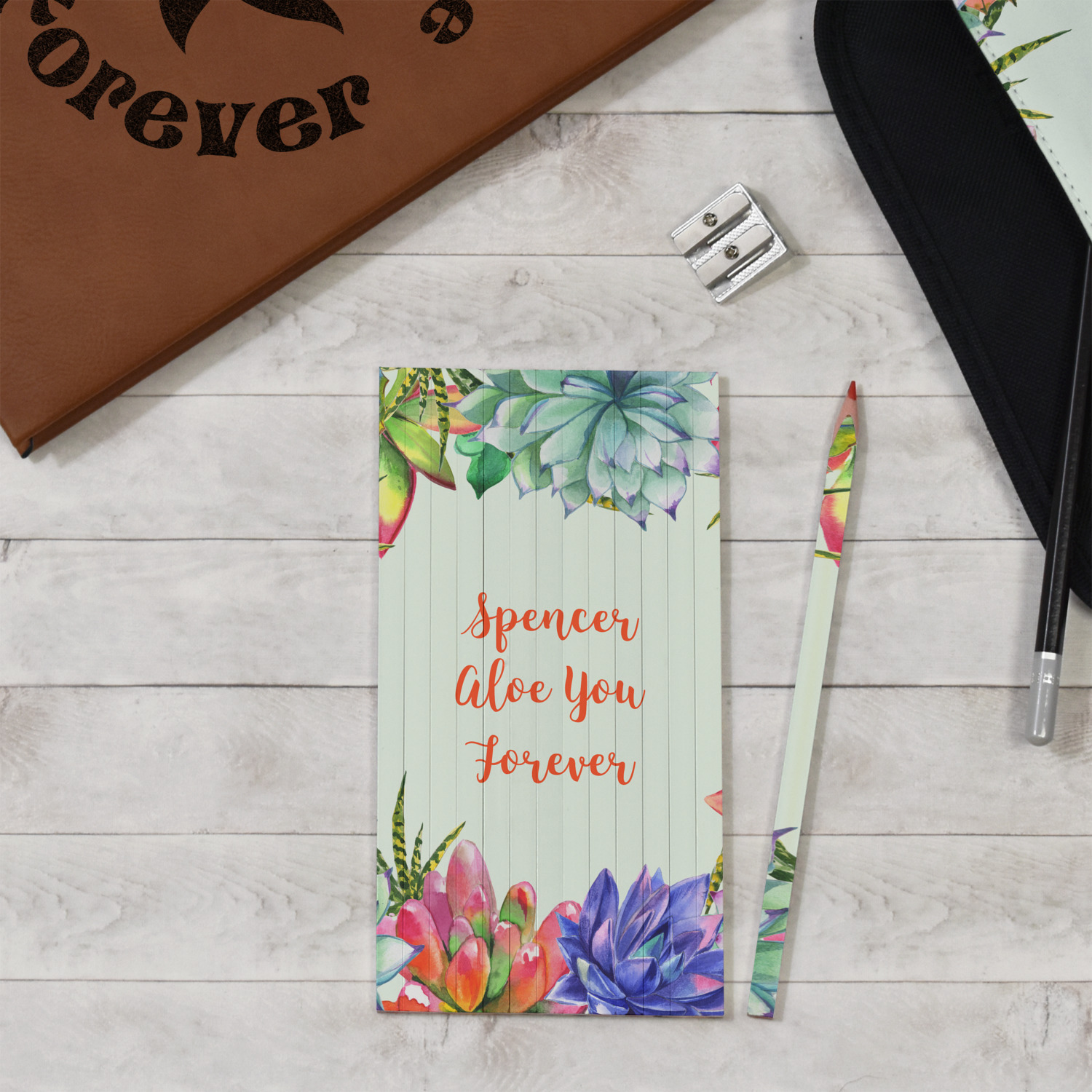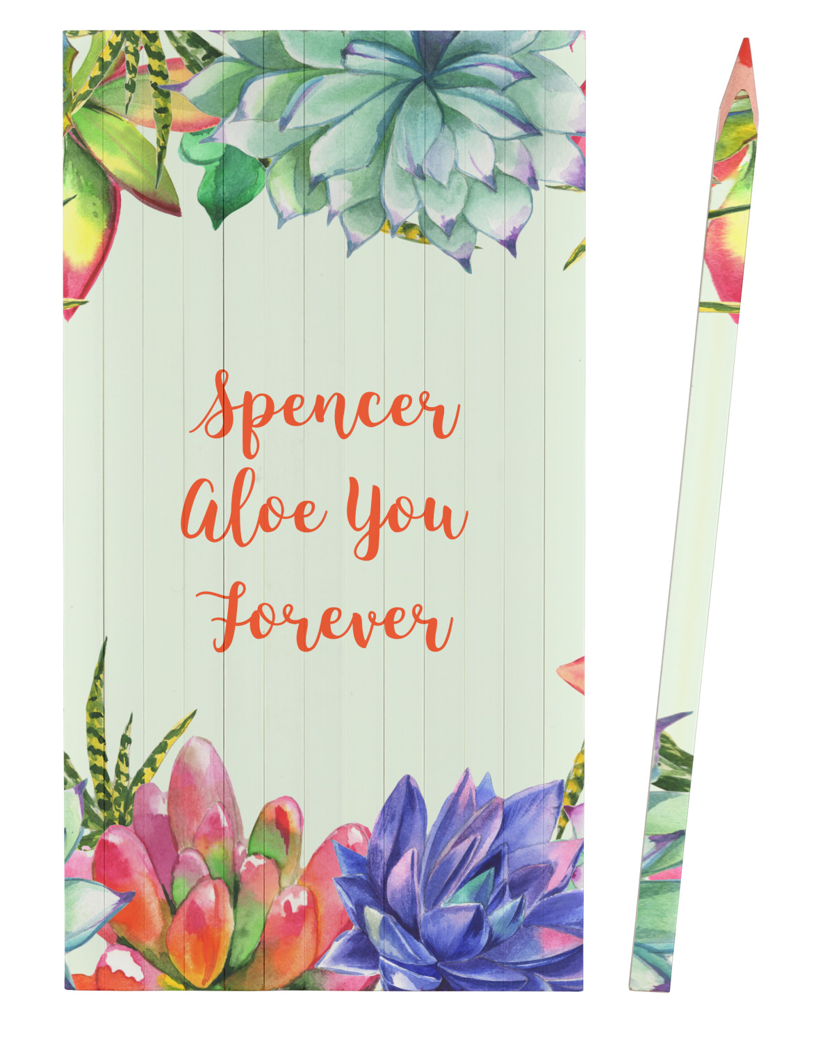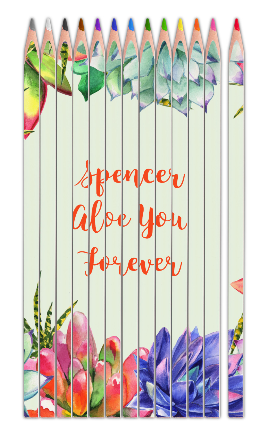 This design is made up of a beautiful frame of succulent illustrations. Because of the nature of the frame, this design will look different on every product. The background is a calming light green. The middle text says "Spencer, Aloe You Forever", which can easily be personalized to your own name or someone else's. You will find orange, green, purple, pink, and orange in this lovely design.