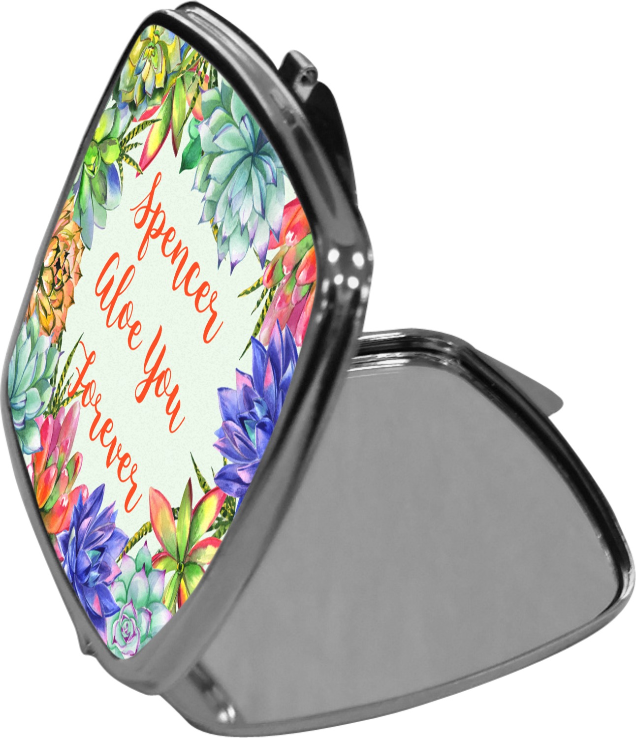 Our compact mirrors are customized with your design on one side. The other side is patterned silver tone metal. Inside, there are two mirrors.