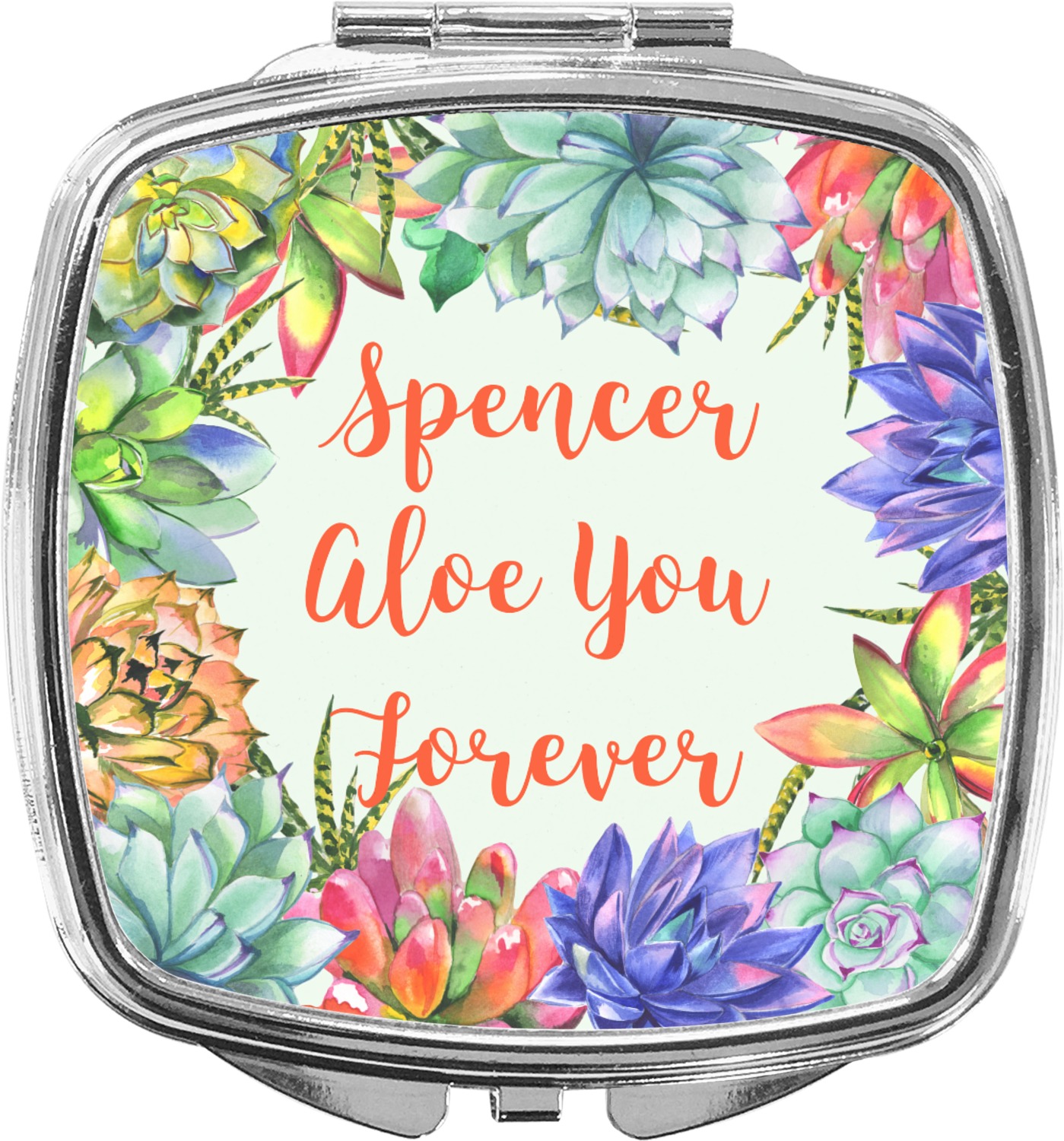 This design is made up of a beautiful frame of succulent illustrations. Because of the nature of the frame, this design will look different on every product. The background is a calming light green. The middle text says "Spencer, Aloe You Forever", which can easily be personalized to your own name or someone else's. You will find orange, green, purple, pink, and orange in this lovely design.