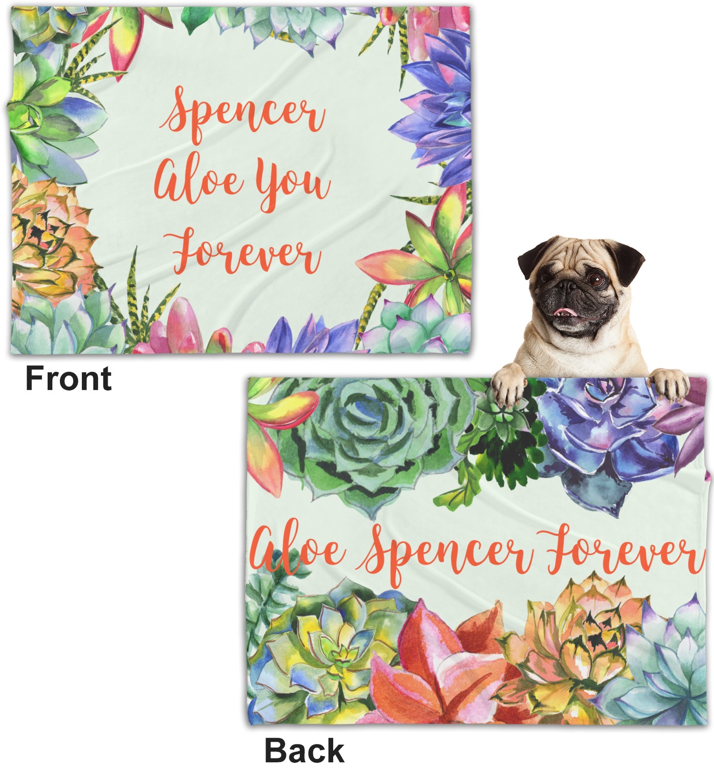 These dog blankets are crafted from a gentle, soft-to-the-touch, minky material. We print your customizations, either matching or differing, on both the top and underside of the blanket. These personalized dog blankets are available in two sizes: regular and large. Our regular size, at 40" x 30", accommodates small and some medium size dogs. At 60" x 50", our large dog blanket is a better fit for bigger breeds. Though specialized for dogs, these blankets still make a thoughtful gift for your favorite feline, or any other pet in mind!