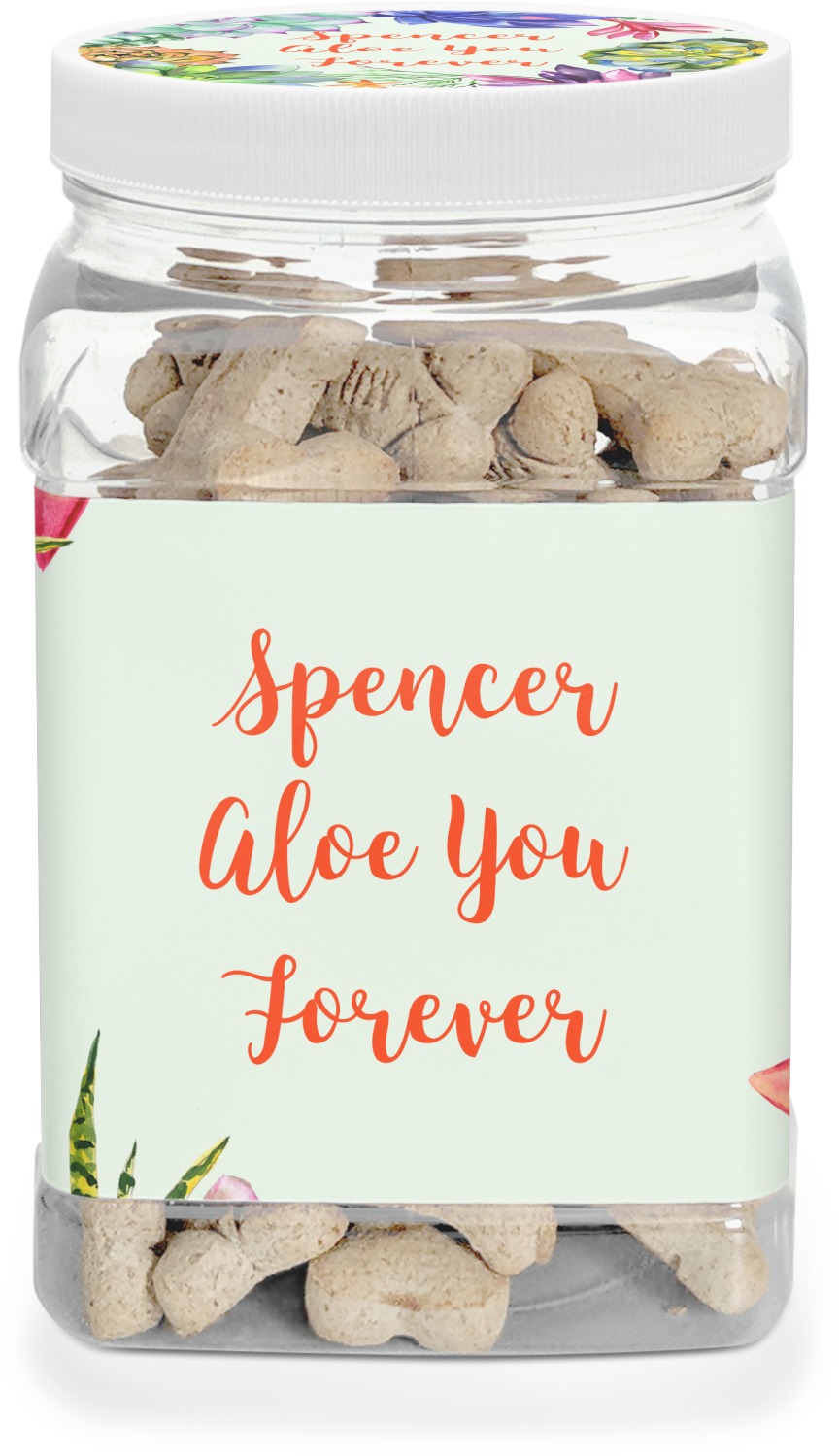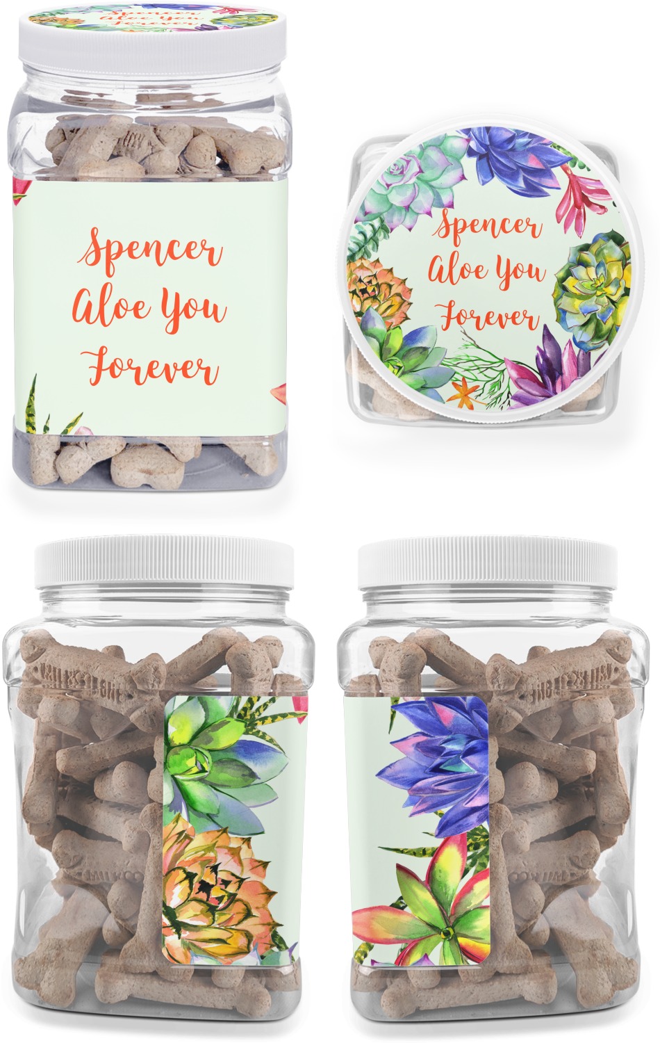 This half gallon jar, made from a sturdy plastic, is the perfect way to keep treats from any naughty pet paws, while still keeping them ready on hand for when your pup performs an impressive trick. This dog cookie jar features a screw-on, white lid that displays your personalized design on a vinyl sticker. We apply another customized sticker that wraps around the front and sides of the jar. Our dog treat jar also has indentations on the rear ends of the sides, which allows for convenient handling, and its square frame allows for easy storage.
