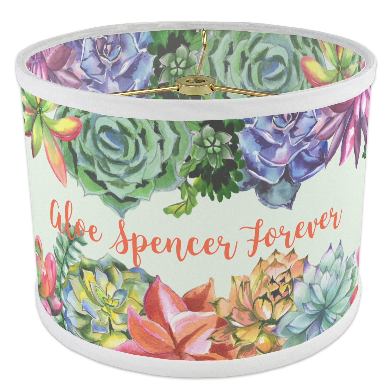 This design is made up of a beautiful frame of succulent illustrations. Because of the nature of the frame, this design will look different on every product. The background is a calming light green. The middle text says "Spencer, Aloe You Forever", which can easily be personalized to your own name or someone else's. You will find orange, green, purple, pink, and orange in this lovely design.