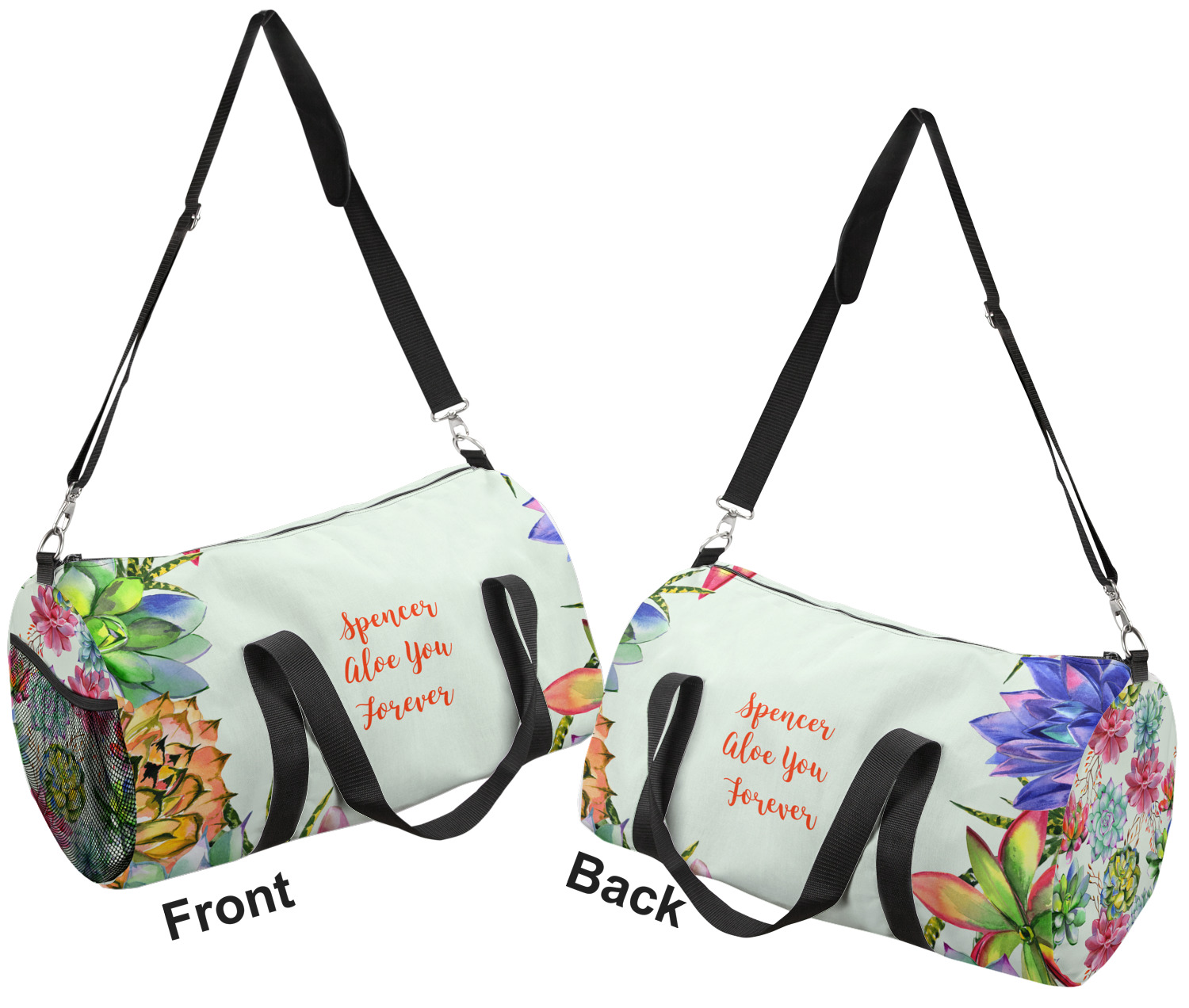 This duffle is a sturdy bag made of a canvas material. It comes in two sizes: Small (19"W x 9.5"H x 9.5"D) and Large (23"W x 12"H x 12"D). The bag is a cylindrical shape with a black adjustable strap and two handles. On one side is an elastic pouch to put a waterbottle or other small item. Your product will be sublimated with your design and is able to be designed on the front, back, and sides. Be sure to remember that the straps may cut into parts of your design if you upload your own artwork.