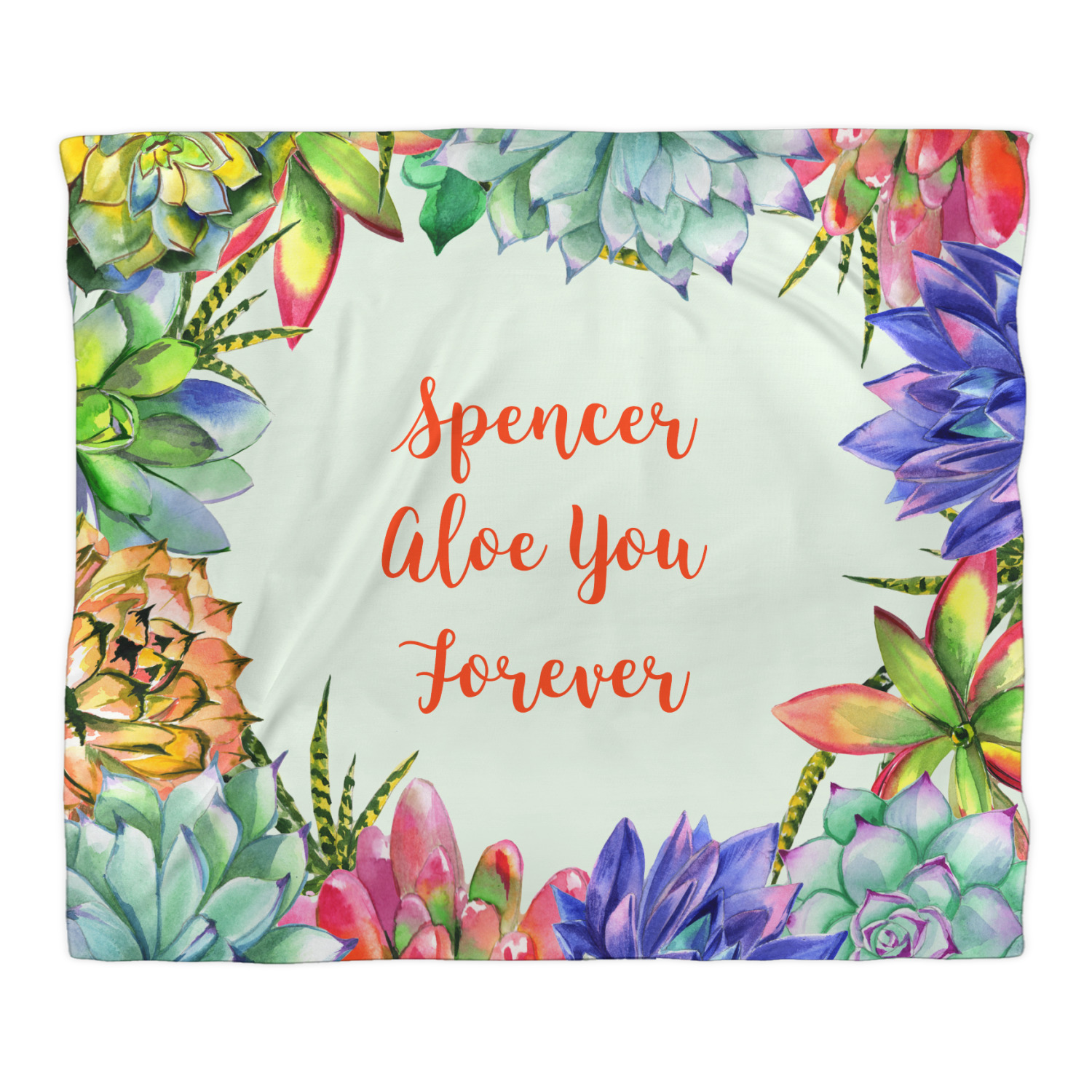 This design is made up of a beautiful frame of succulent illustrations. Because of the nature of the frame, this design will look different on every product. The background is a calming light green. The middle text says "Spencer, Aloe You Forever", which can easily be personalized to your own name or someone else's. You will find orange, green, purple, pink, and orange in this lovely design.