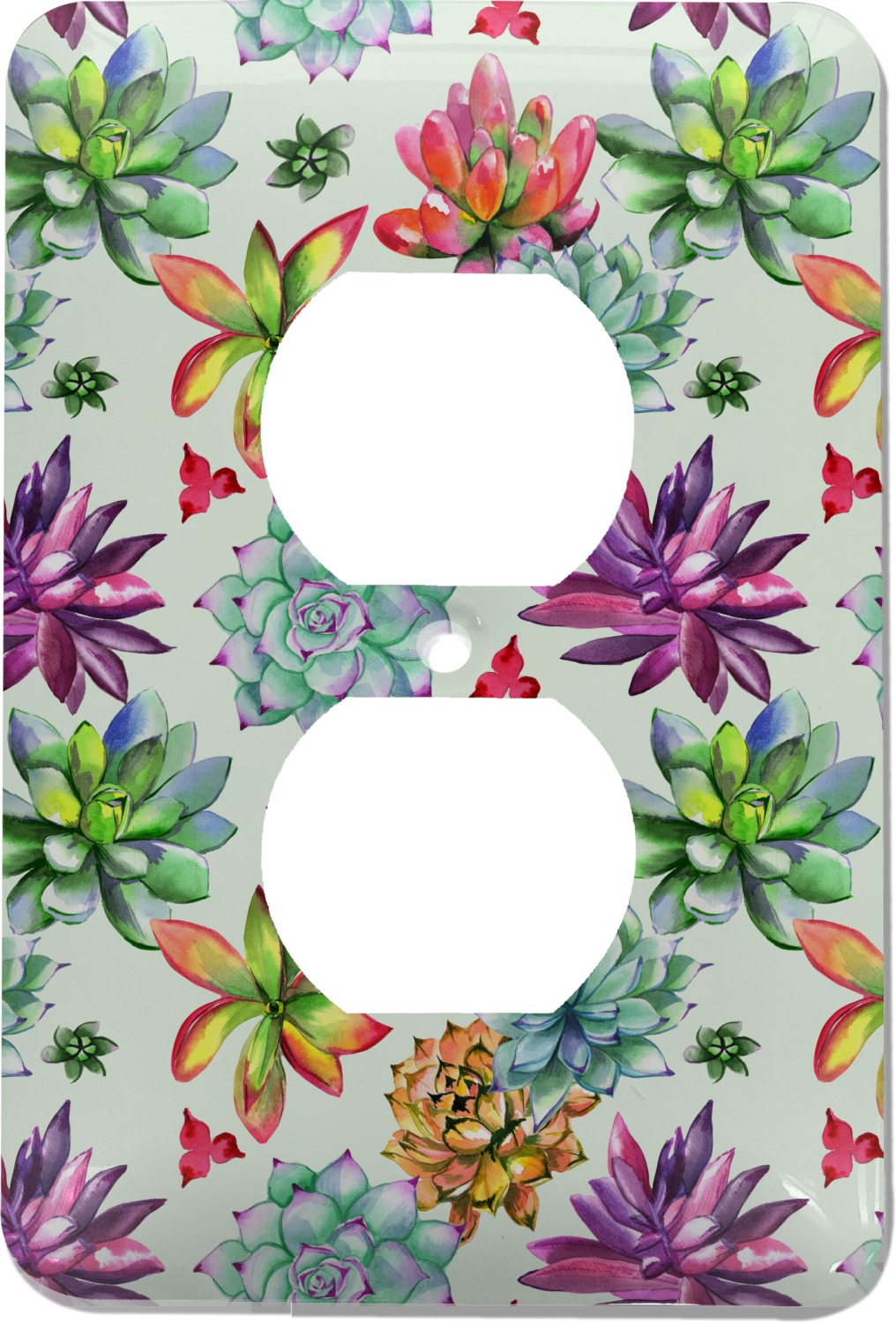 These outlet covers are made from a sturdy metal and display your design across its face. A satin finish coats the design to give it a finished look. The center of this outlet plate cover has a small hole to accommodate a screw upon installation. With your purchase of this decorative outlet cover, we include one screw. This outlet plate is of a standard size, and measures at approximately 3.5 by 5 inches.