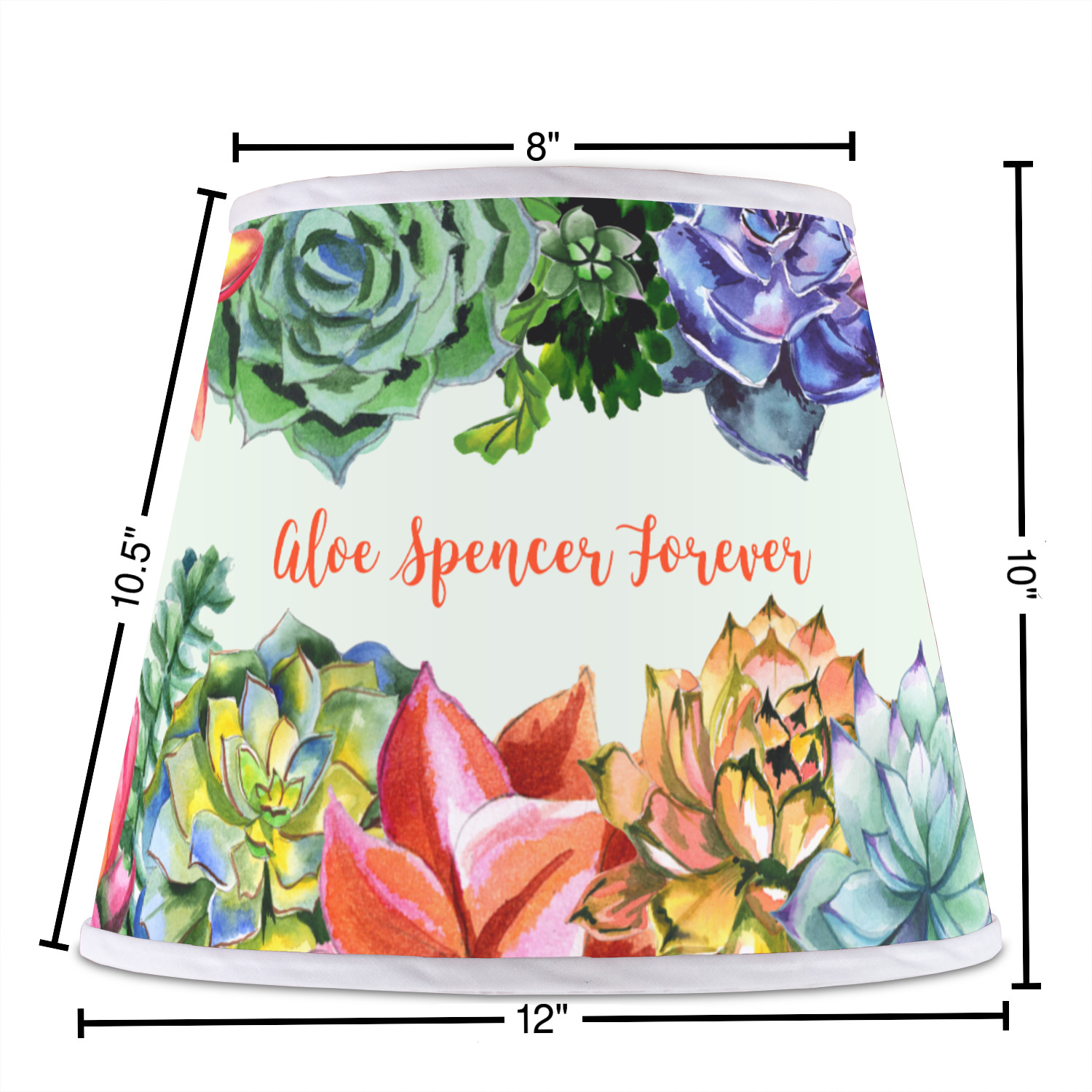 The base of this lampshade is 12 inches in diameter, and the top spans 8 inches in diameter. The total height of the lampshade is 10 inches. The angled nature of this custom lampshade concentrates the light, making it ideal for smaller spaces. This lampshade is made of matte, polyfilm, and displays your customization in its middle. The top and bottom of this colorful lamp shade are lined with a white fabric ribbon (which can be replaced with black inside the design studio) which frames your design and creates a sophisticated finish. As an UNO fitter lampshade, this unique lamp shade will fit a variety of bases.