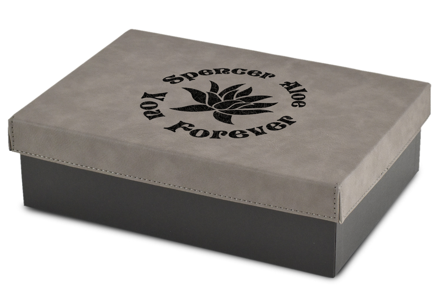 These gift boxes are available in 3 different sizes to accommodate various sized gifts. Available in gray as a neutral color for any occasion as well as to showcase your design boldly. Engraved with a laser this high quality paper board and faux leather gift box is unique and makes any gift stand out.