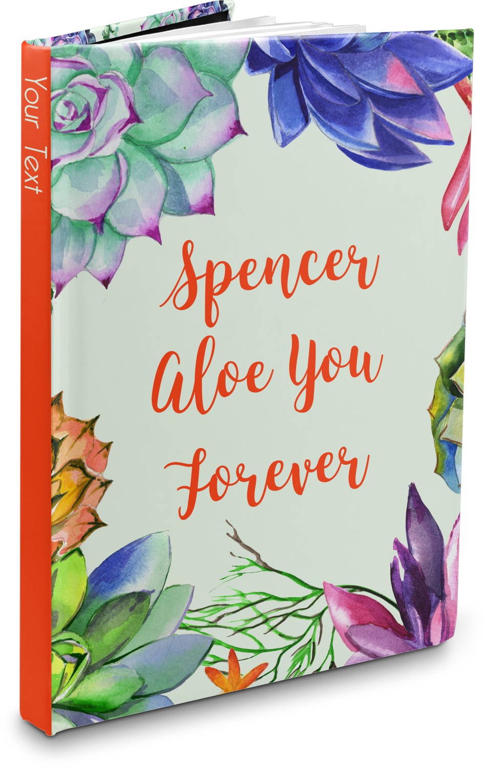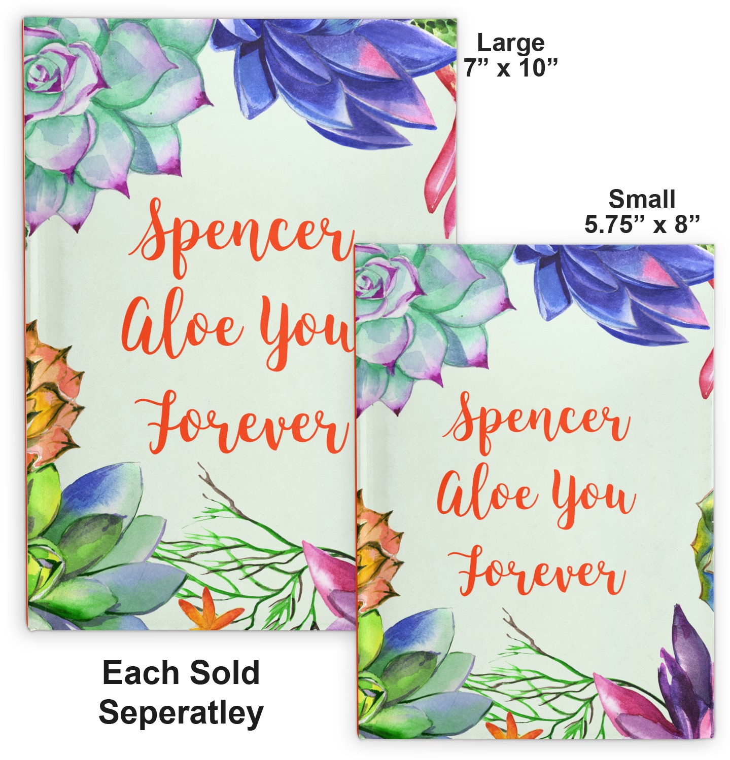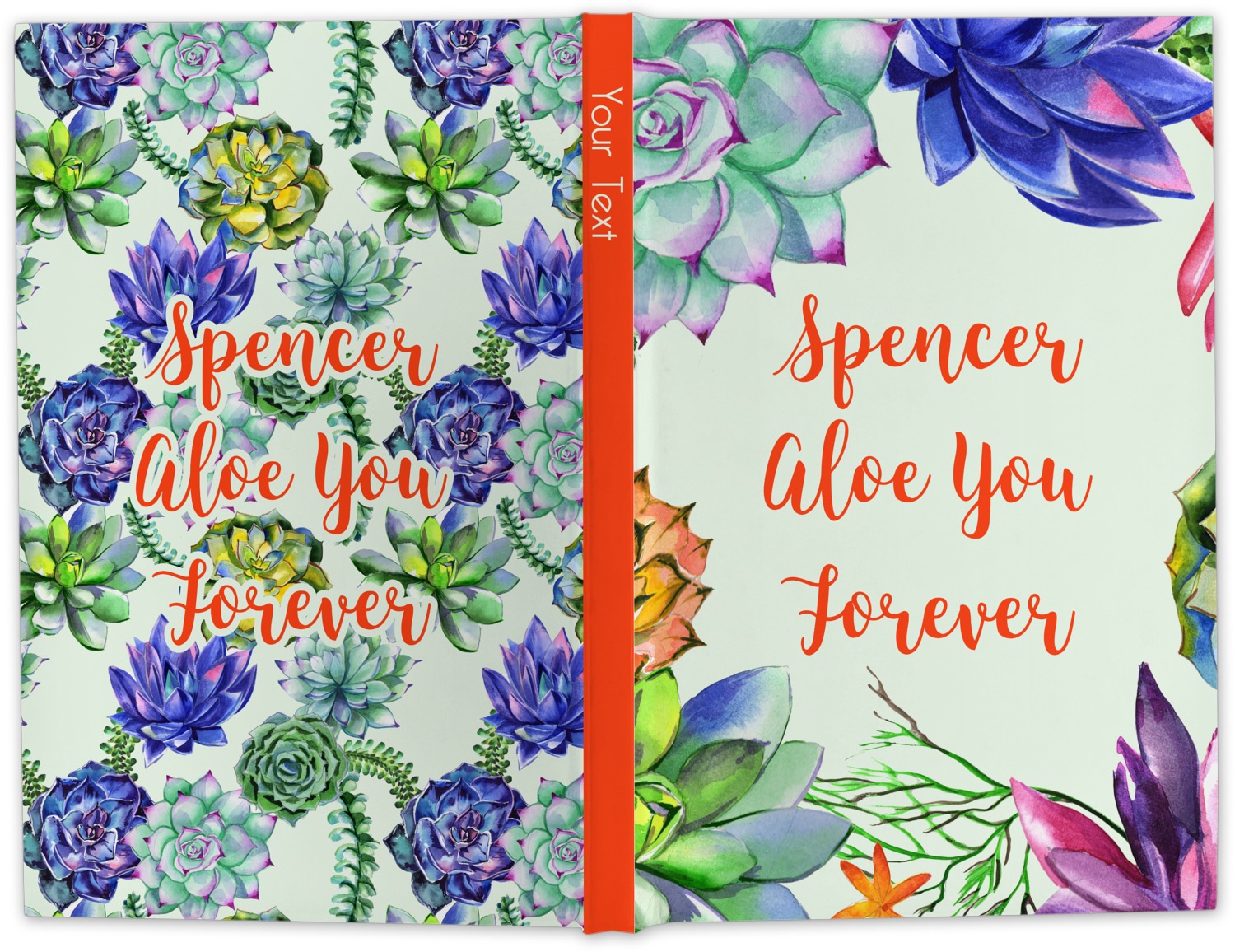 This design is made up of a beautiful frame of succulent illustrations. Because of the nature of the frame, this design will look different on every product. The background is a calming light green. The middle text says "Spencer, Aloe You Forever", which can easily be personalized to your own name or someone else's. You will find orange, green, purple, pink, and orange in this lovely design.