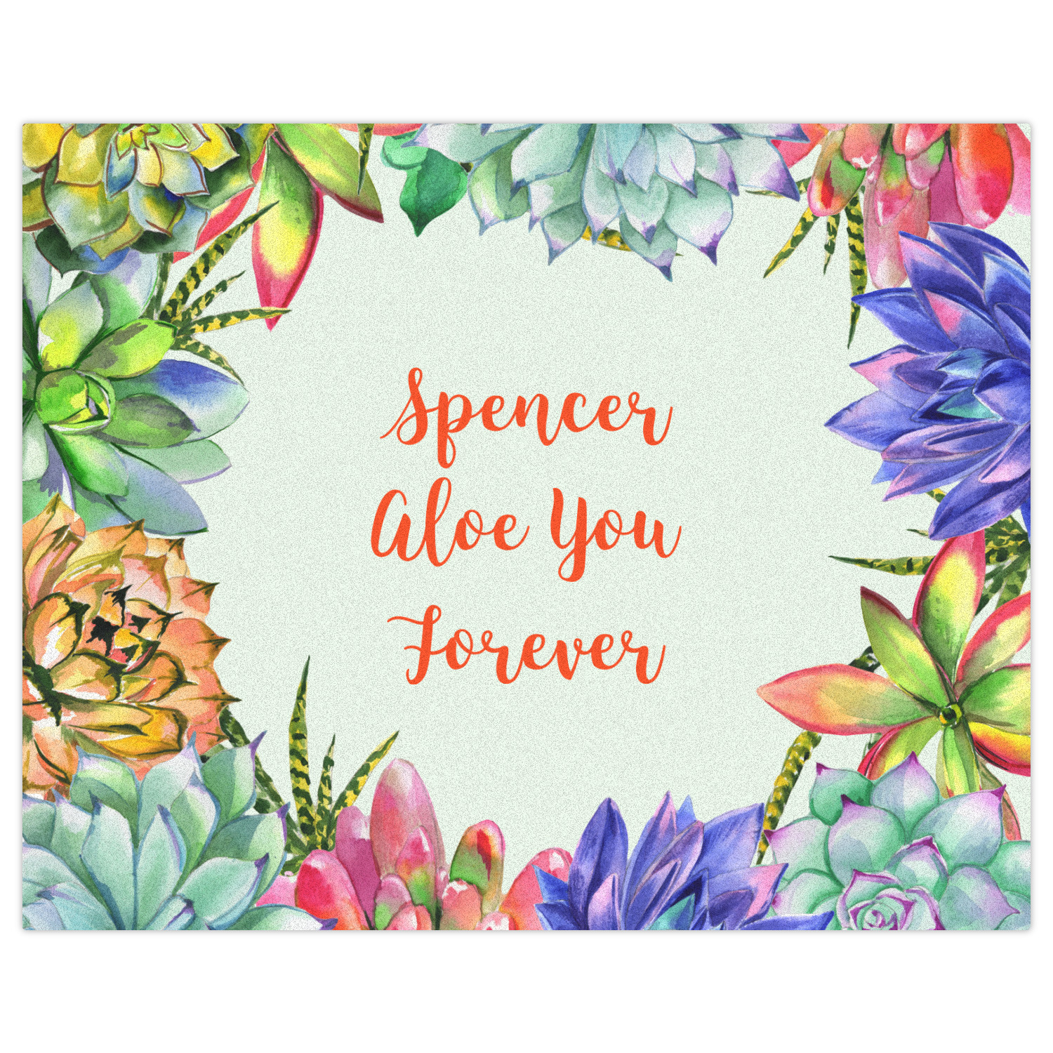 This design is made up of a beautiful frame of succulent illustrations. Because of the nature of the frame, this design will look different on every product. The background is a calming light green. The middle text says "Spencer, Aloe You Forever", which can easily be personalized to your own name or someone else's. You will find orange, green, purple, pink, and orange in this lovely design.