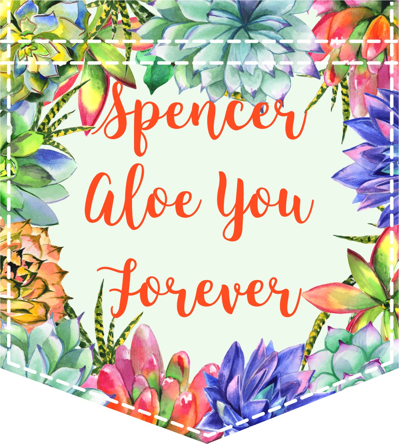 This design is made up of a beautiful frame of succulent illustrations. Because of the nature of the frame, this design will look different on every product. The background is a calming light green. The middle text says "Spencer, Aloe You Forever", which can easily be personalized to your own name or someone else's. You will find orange, green, purple, pink, and orange in this lovely design.