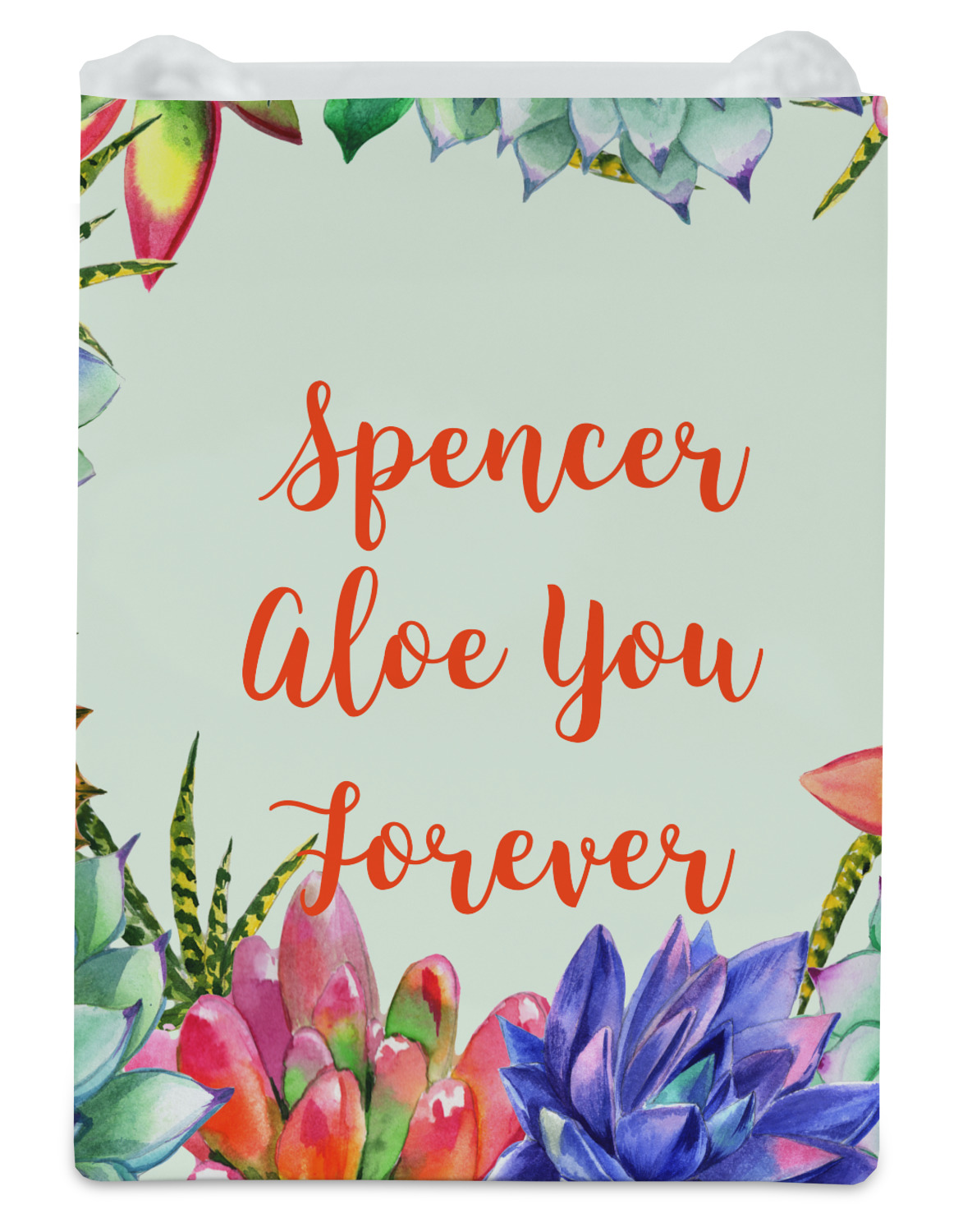 This design is made up of a beautiful frame of succulent illustrations. Because of the nature of the frame, this design will look different on every product. The background is a calming light green. The middle text says "Spencer, Aloe You Forever", which can easily be personalized to your own name or someone else's. You will find orange, green, purple, pink, and orange in this lovely design.