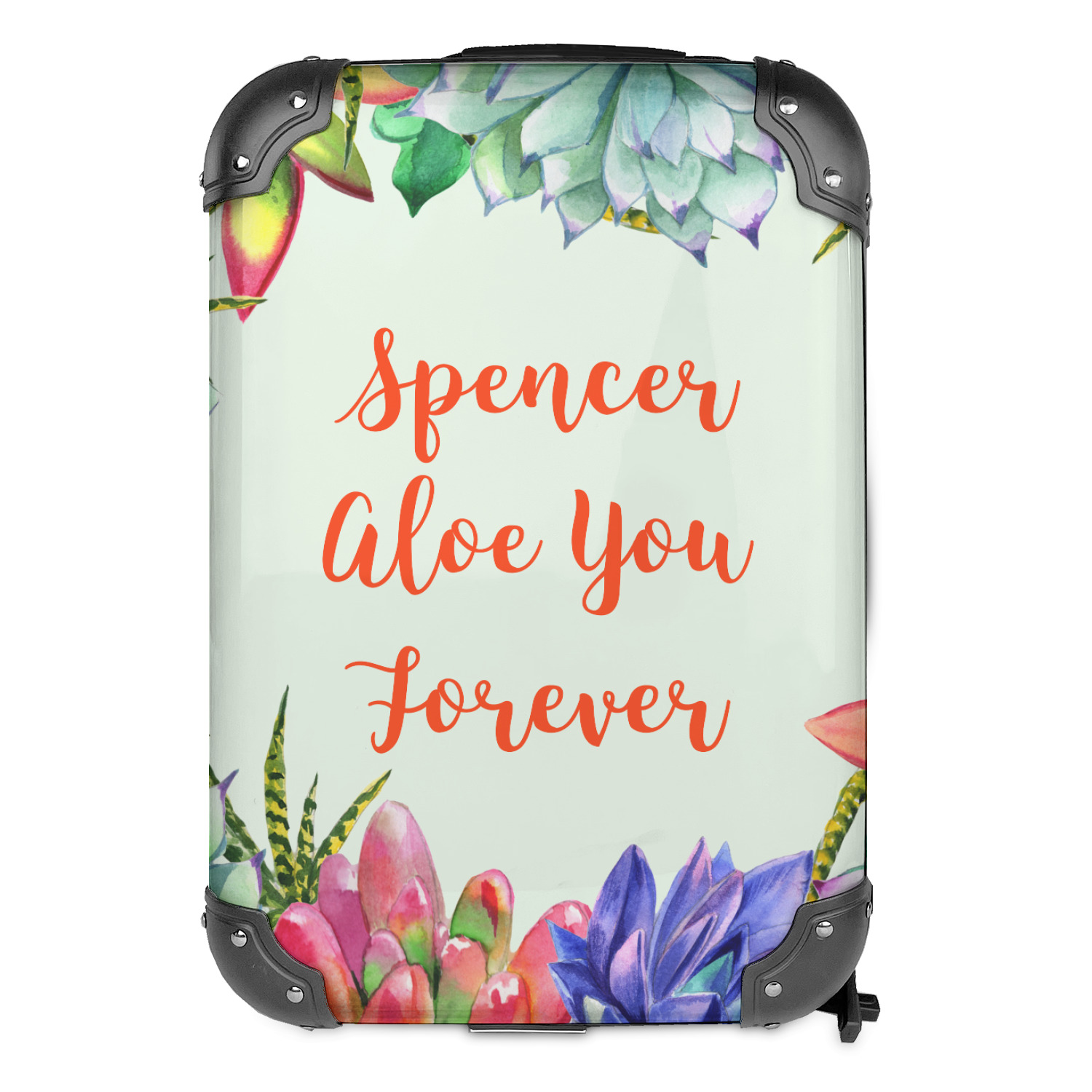 This design is made up of a beautiful frame of succulent illustrations. Because of the nature of the frame, this design will look different on every product. The background is a calming light green. The middle text says "Spencer, Aloe You Forever", which can easily be personalized to your own name or someone else's. You will find orange, green, purple, pink, and orange in this lovely design.