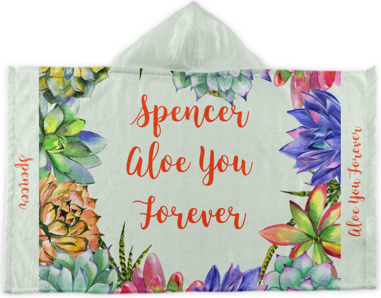 This design is made up of a beautiful frame of succulent illustrations. Because of the nature of the frame, this design will look different on every product. The background is a calming light green. The middle text says "Spencer, Aloe You Forever", which can easily be personalized to your own name or someone else's. You will find orange, green, purple, pink, and orange in this lovely design.