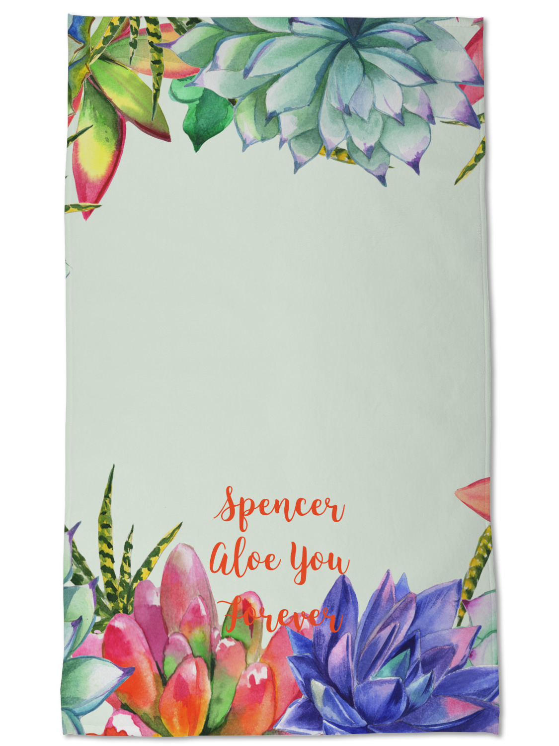 This design is made up of a beautiful frame of succulent illustrations. Because of the nature of the frame, this design will look different on every product. The background is a calming light green. The middle text says "Spencer, Aloe You Forever", which can easily be personalized to your own name or someone else's. You will find orange, green, purple, pink, and orange in this lovely design.
