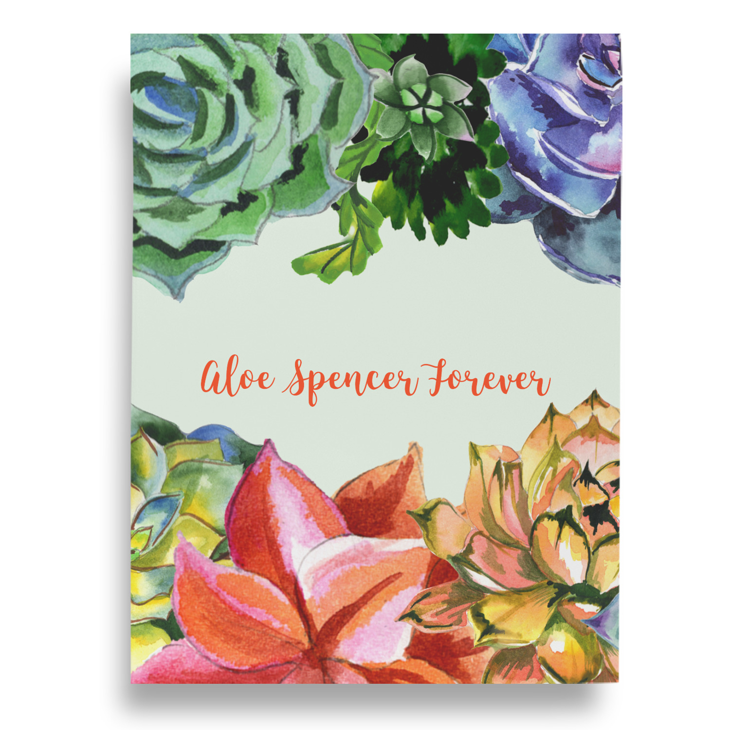 This design is made up of a beautiful frame of succulent illustrations. Because of the nature of the frame, this design will look different on every product. The background is a calming light green. The middle text says "Spencer, Aloe You Forever", which can easily be personalized to your own name or someone else's. You will find orange, green, purple, pink, and orange in this lovely design.
