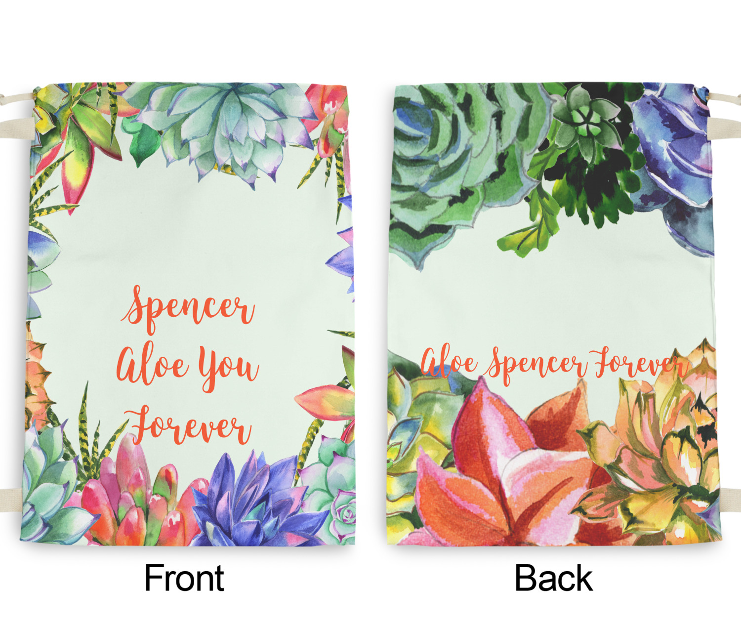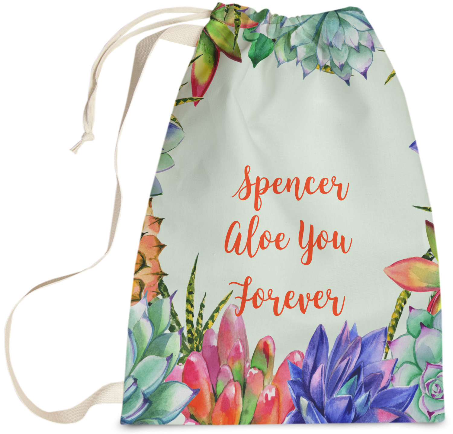 This design is made up of a beautiful frame of succulent illustrations. Because of the nature of the frame, this design will look different on every product. The background is a calming light green. The middle text says "Spencer, Aloe You Forever", which can easily be personalized to your own name or someone else's. You will find orange, green, purple, pink, and orange in this lovely design.