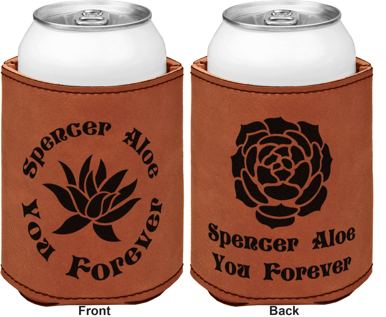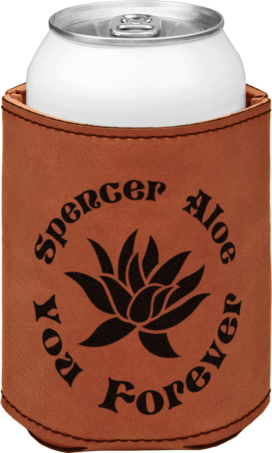 This can sleeve is made from a cognac-brown leatherette and stitched with a sturdy, black thread. A slim padding lines the inside of your can sleeve to allow for a better fit once your drink is inserted. The sleeve itself measures at 4 by 4.5 inches, allowing this custom can sleeve to accommodate most canned drinks. Your personalized design can be engraved on the front and back, or solely the front. When laser-engraved, your design appears as a black coloration which contrasts the leatherette nicely.