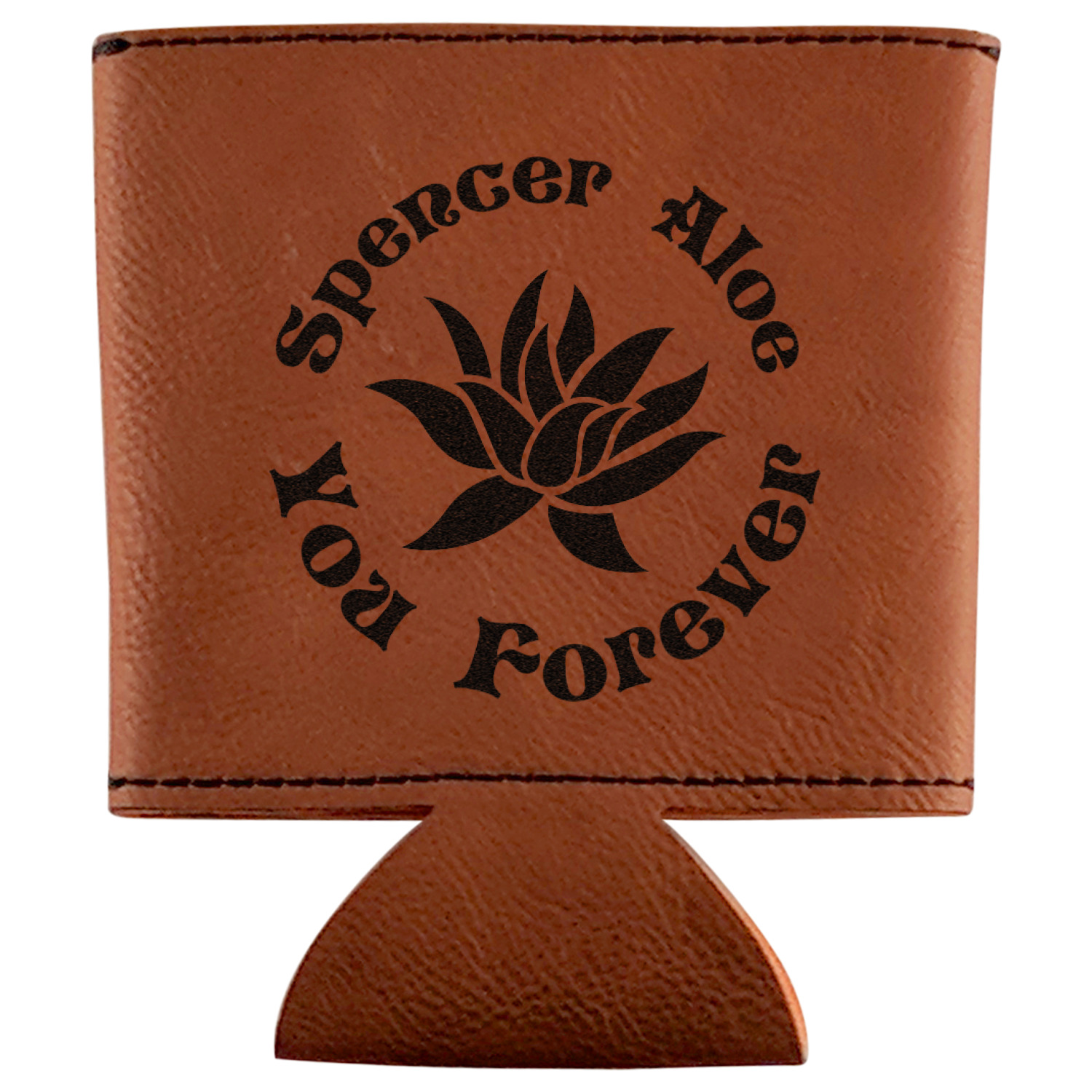 This can sleeve is made from a cognac-brown leatherette and stitched with a sturdy, black thread. A slim padding lines the inside of your can sleeve to allow for a better fit once your drink is inserted. The sleeve itself measures at 4 by 4.5 inches, allowing this custom can sleeve to accommodate most canned drinks. Your personalized design can be engraved on the front and back, or solely the front. When laser-engraved, your design appears as a black coloration which contrasts the leatherette nicely.