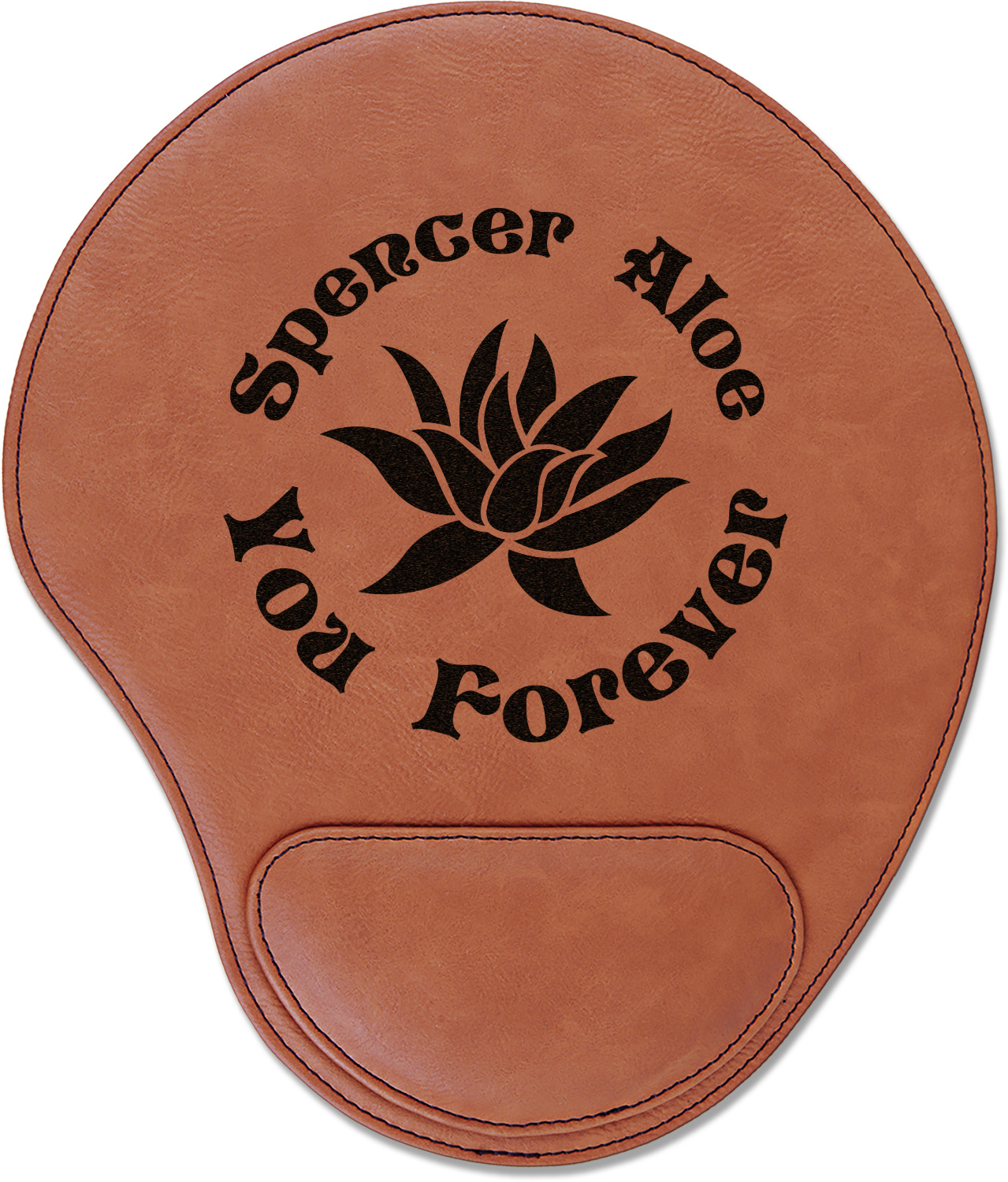 In a rounded shape, this mouse pad is made of a luxurious, cognac-colored leatherette. The nature of this material allows your mouse to glide smoothly across its surface. Strong stitching lines the edges to guarantee stability and strength. As added support for tired wrists, your personalized mouse pad features a supportive wrist rest at its bottom. This model measures at 10.25" x 9", while its wrist pad is approximately 5" x 2.75", with a thickness of 0.75". Your personalized design is laser engraved into the front face of this mouse pad.