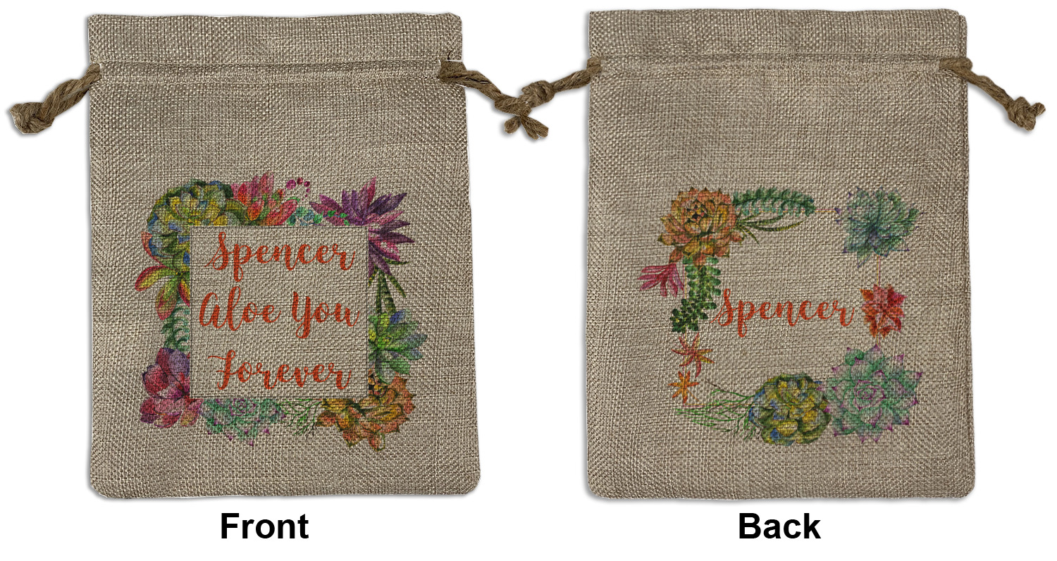 We sell our Burlap Gift Bags in 3 variant sized bags. Made with burlap polyester, each personalized bag can be secured with a twine drawstring pull. Your custom design is available to print on one side or both sides - completely up to you! The sizes of the bags measure approximately 4.5" x 6.5" for the smallest size, 6.5" x 8.0" for the medium size, and 6.5" x 13.5" for the large-sized bag.